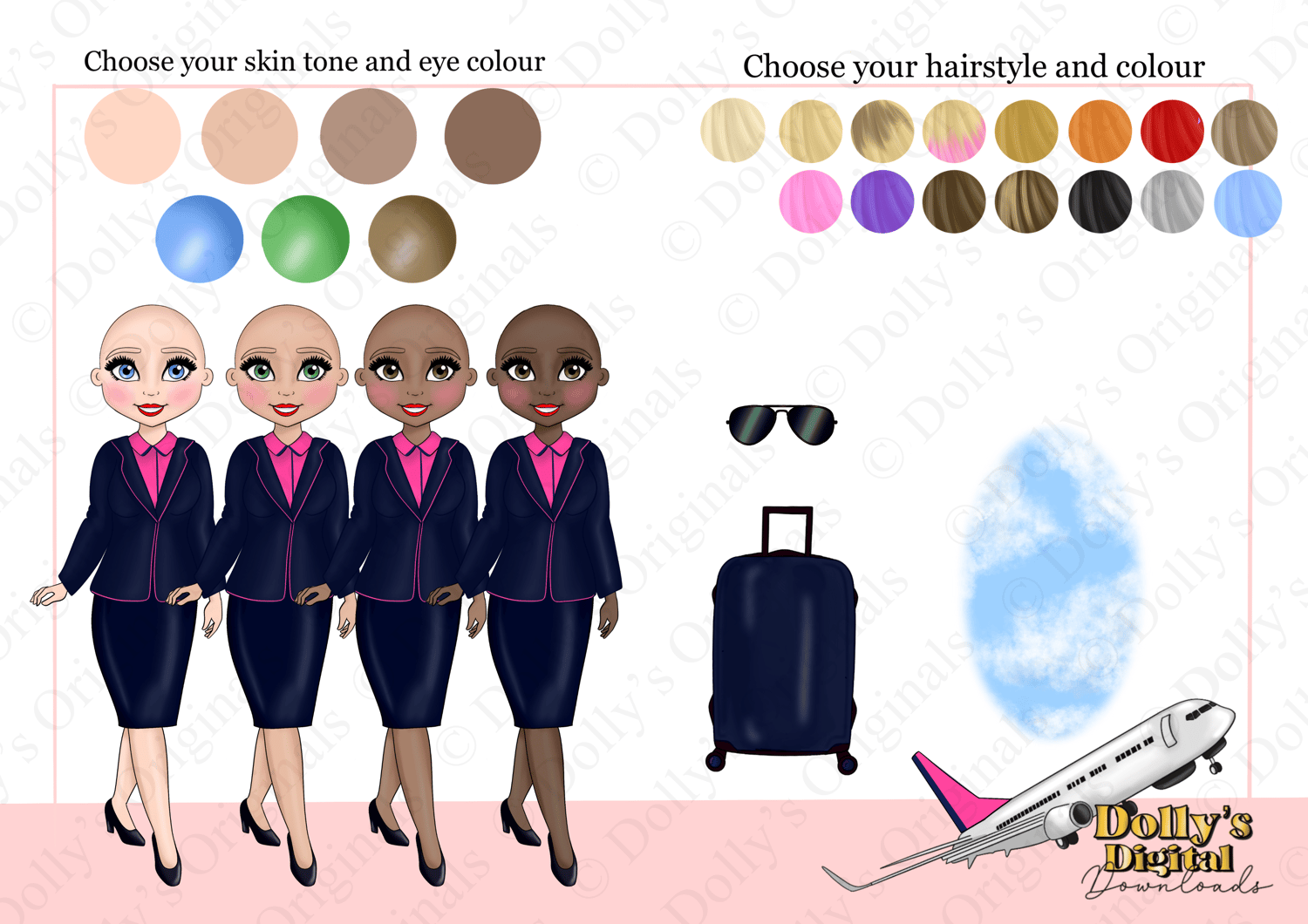Instant digital download of our Flight Attendant in Navy and Pink Character Doll Bundle PNG (49 PNG’s)