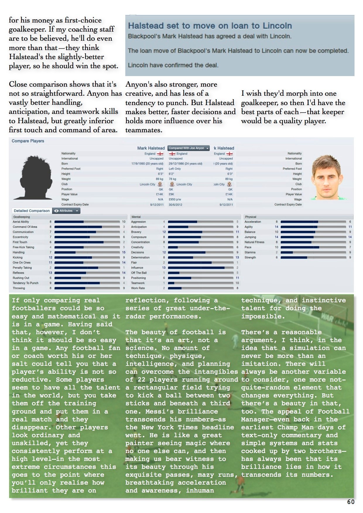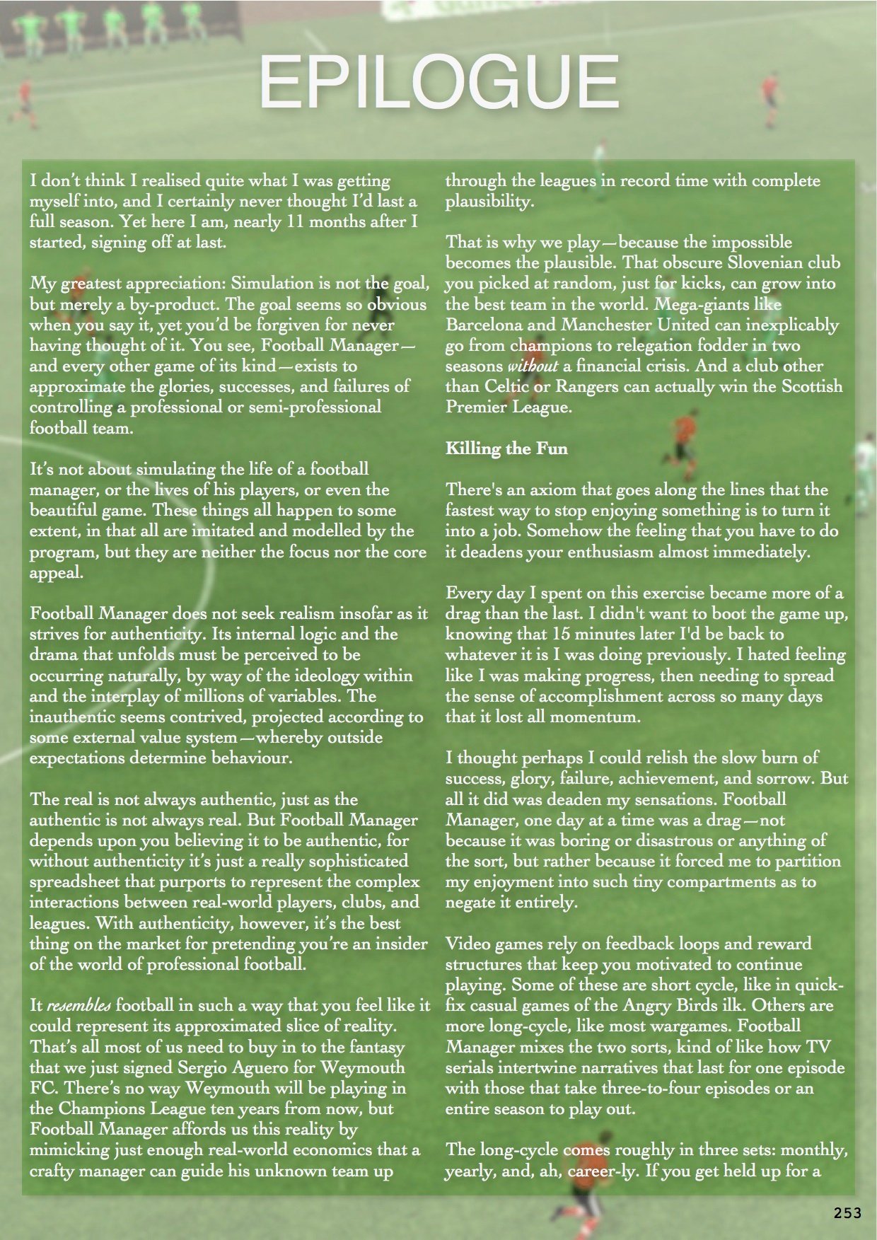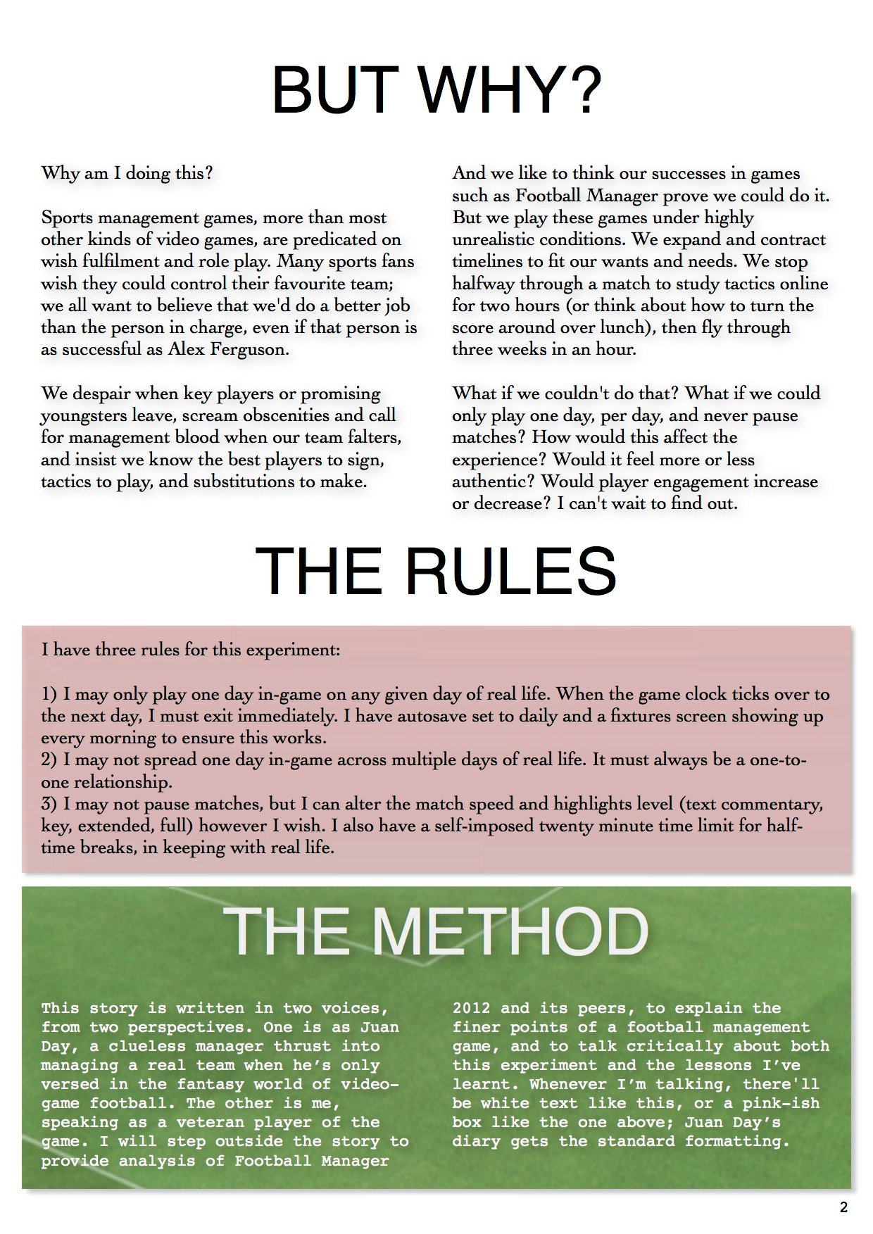 The ebook contains essays on the nature of a football management simulation, scattered between Juan Day's diary entries as he (and I) navigate the world of Football Manager 2012 one day at a time.
