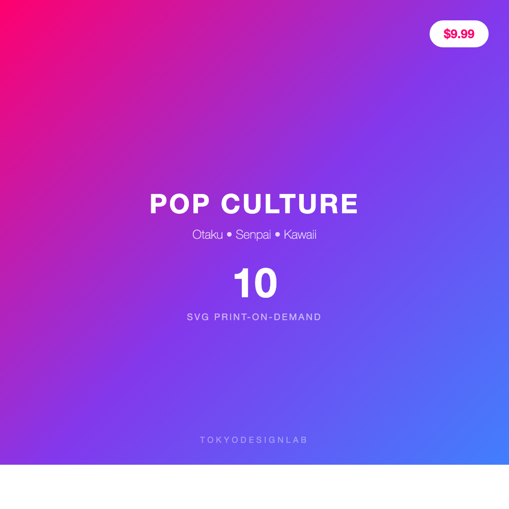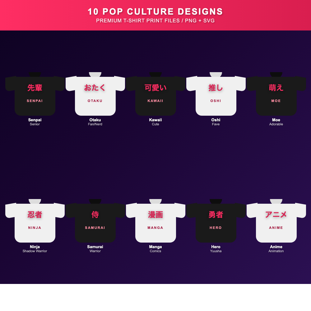 Japanese Pop Culture T-Shirt Designs 10-Pack | Otaku Senpai Kawaii SVG | Print on Demand