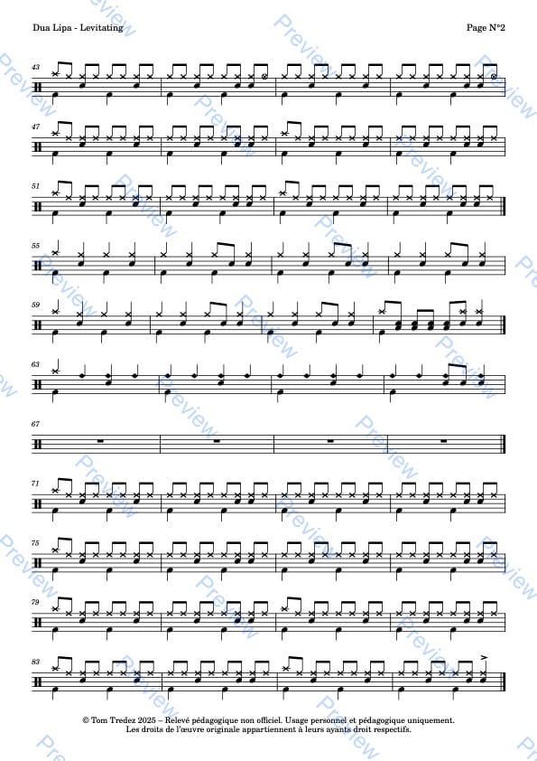 Partition complète de Dua Lipa - Levitating, réarrangée pour la batterie, reprenant à l'identique la version de l'album.