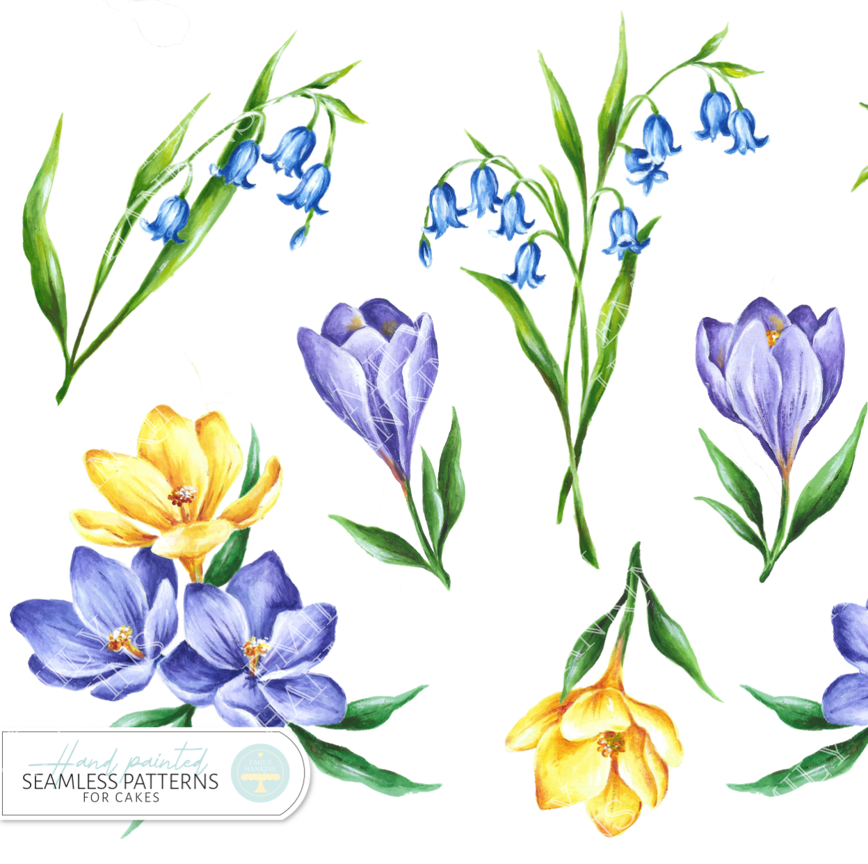 The design is inspired by early spring flowers and features bluebells and crocuses. This sheet design is a collection of individual flowers and flower clusters perfect for carefully cutting out and applying to your cake applique style! Each flower has been hand painted by Emily and painstakingly crafted into a seamless pattern for your cake designs.