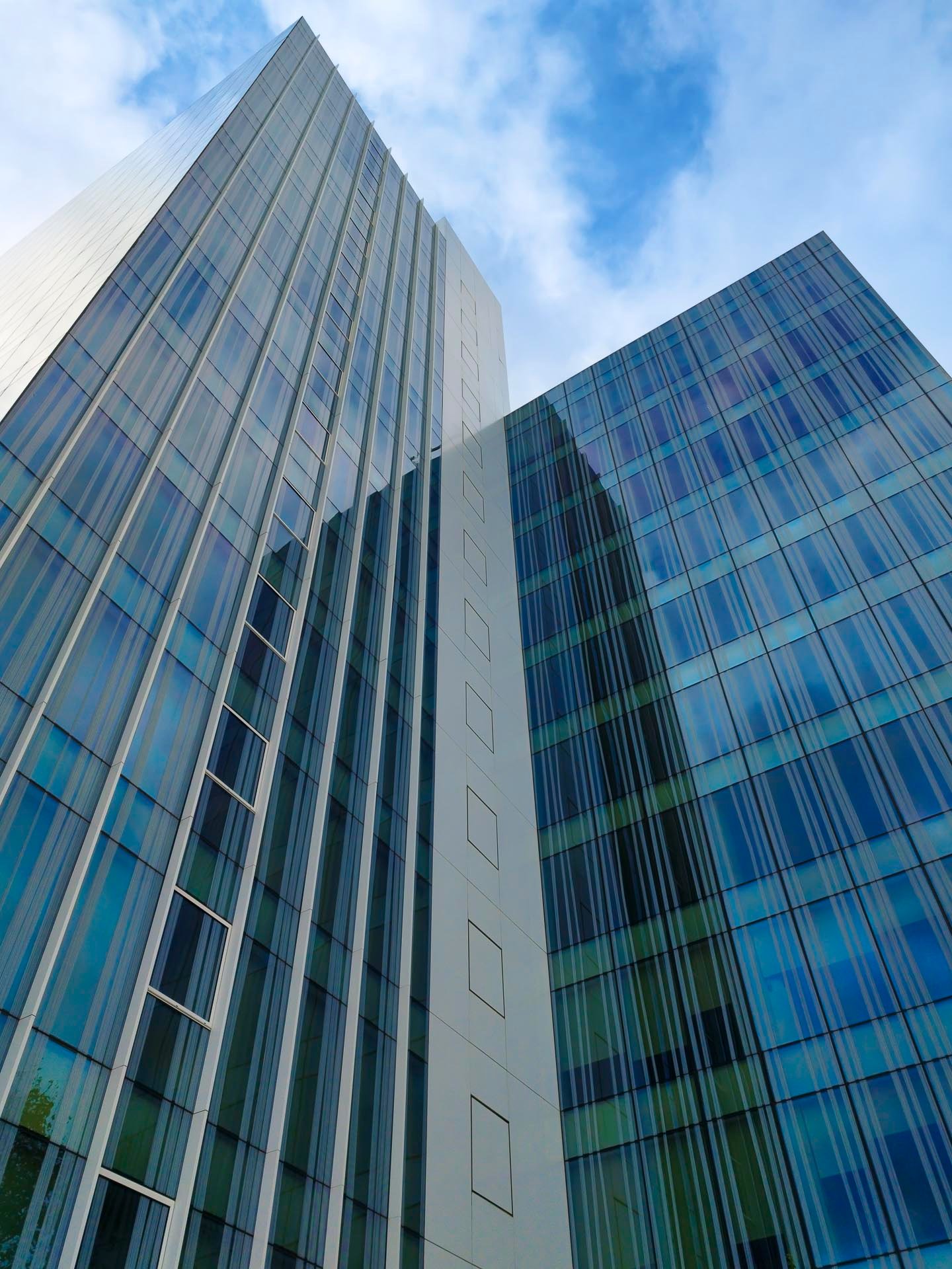 Tall glass skyscrapers rise against a backdrop of blue sky, reflecting light and colors on their surfaces. The modern architecture showcases sleek lines and a sense of urban sophistication.