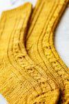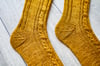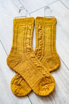 These socks look complicated but are actually far simpler to knit than you may realise. The cables down the front of the sock provide lots of interest when knitting them and the pattern itself is rather intuitive once you get going. The ribbing down the back of the sock leg also helps to ensure a good fit and elasticity in the socks (which can sometimes be lost when cables are included in knitting).