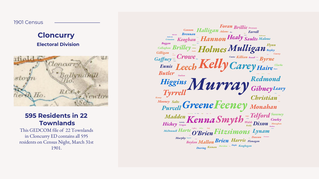 This file contains the details of all 595 residents of Cloncurry on Census Night March 31st 1901. The 22 townlands in this Electoral District, with the number of residents in brackets is as follows: