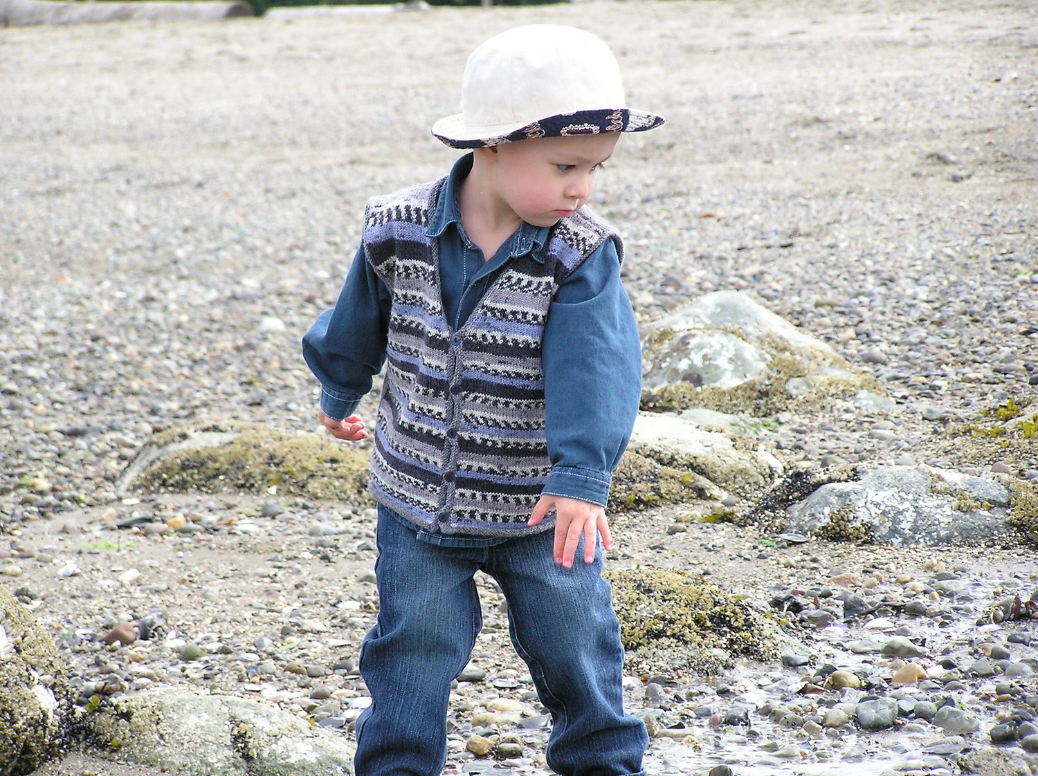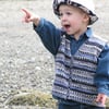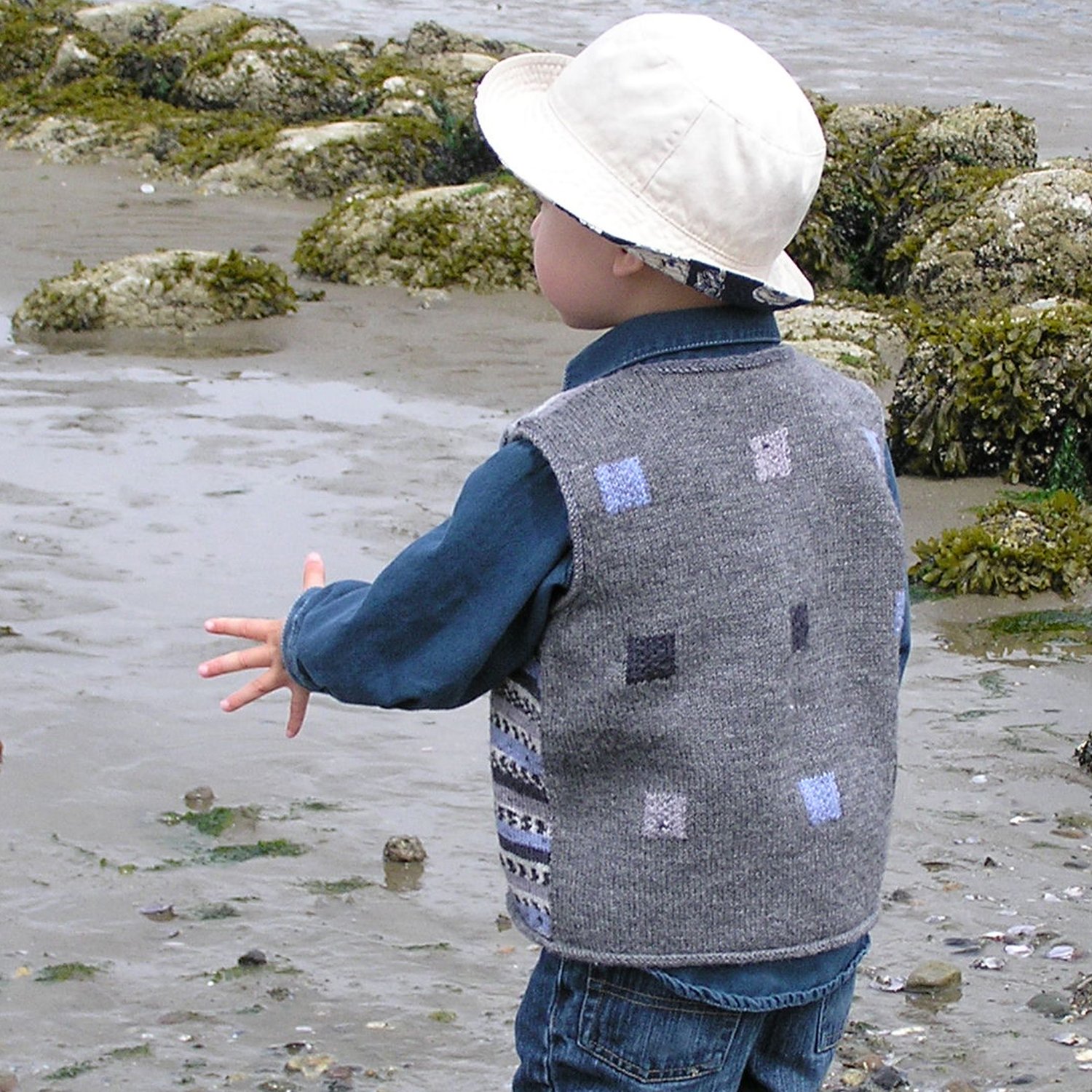 What a great vest to wear over a shirt! Using strands taken from the self-patterning yarn, the squares of colour on the back echo the stripes on the front to great effect. Because it’s sleeveless, it’s really built for action!