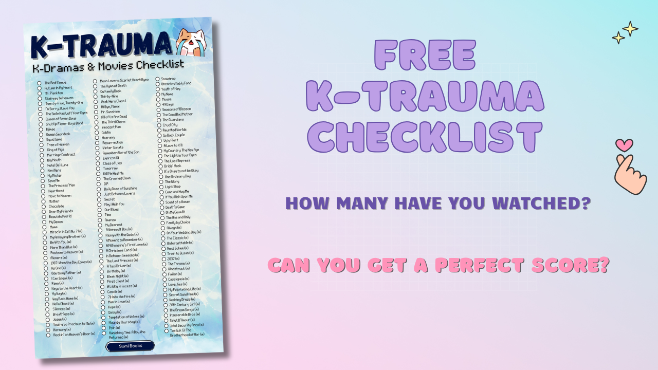 Get your K-Trauma Checklist with Tearjerker K-Dramas and K-Movies. Either for when you want to have a good cry or know which ones to avoid if your mental health cannot deal with the heartbreak ;-)