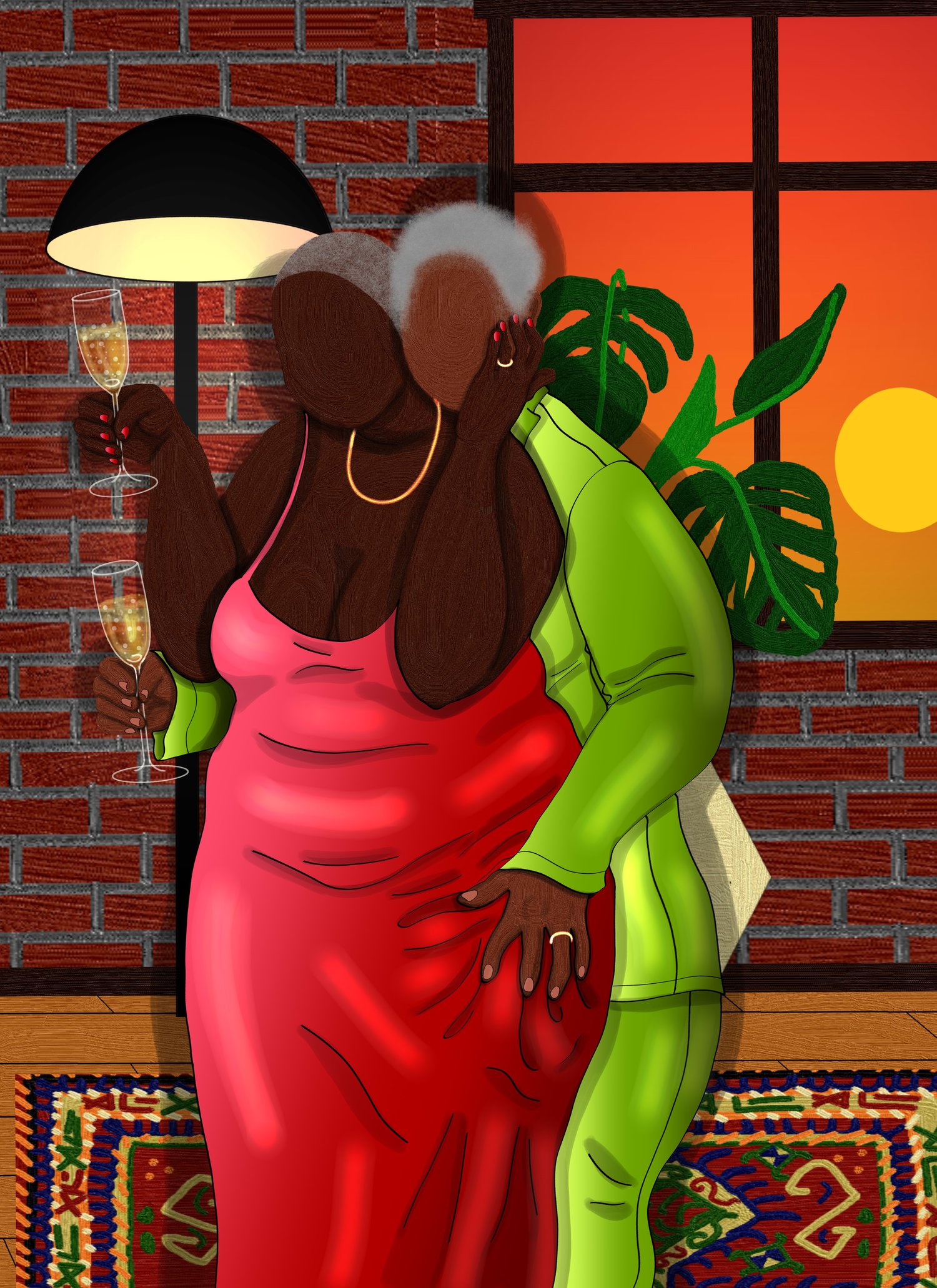 a digital illustration by Mercy Thokozane Minah inspired by the song 'Champagne Shit' Janelle Monae from the album Age of Pleasure (2023).