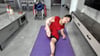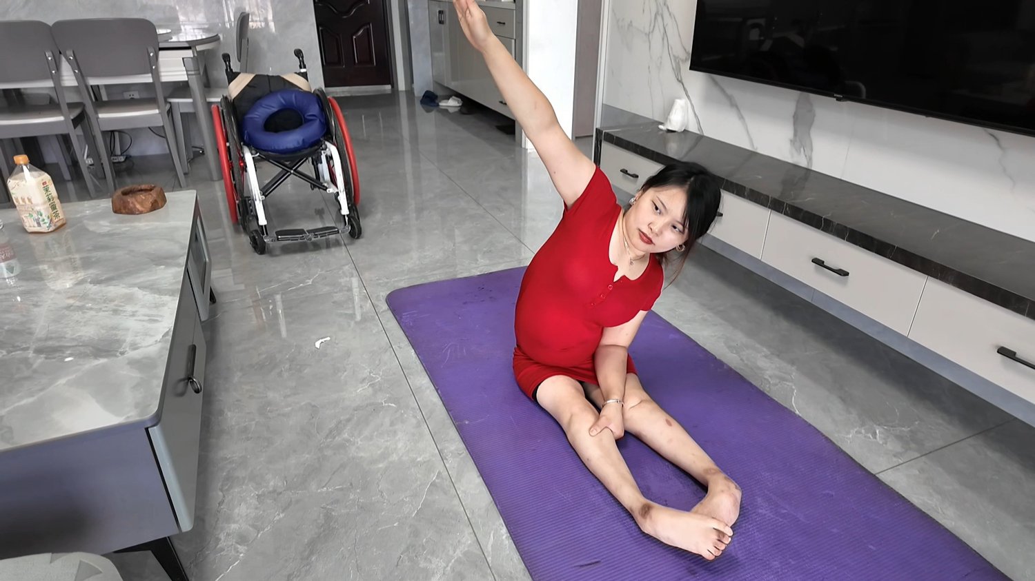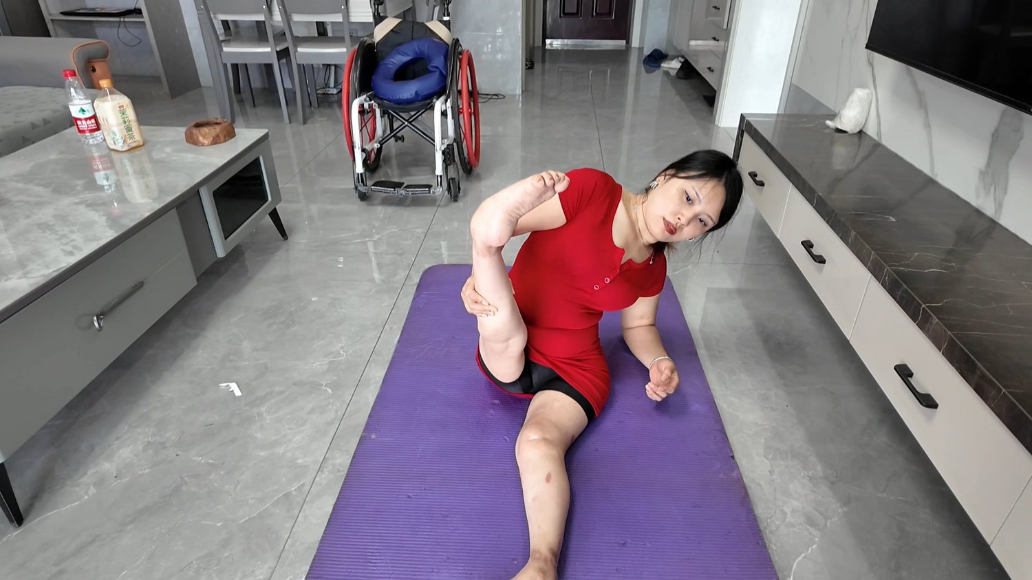 Today, Shera demonstrated how she practices yoga using her weak and flexible legs. Wearing a red yoga outfit, she performed various poses on a yoga mat, and although her movements weren't perfectly standard, she did them very seriously.