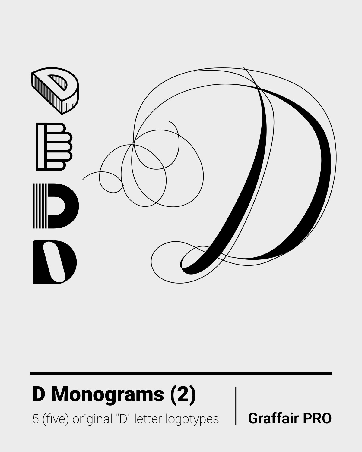 D Monograms (2): The 2nd set of five original "D" letter logo monograms, selected from a total of 39, included in the "1050 SVG Monograms" super package, which also features an Index catalog.