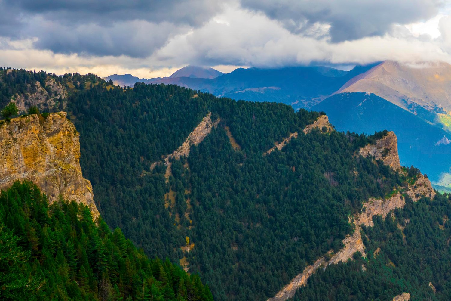 Landscape, ridges in the High Pyrenees, dense with trees, storm clouds