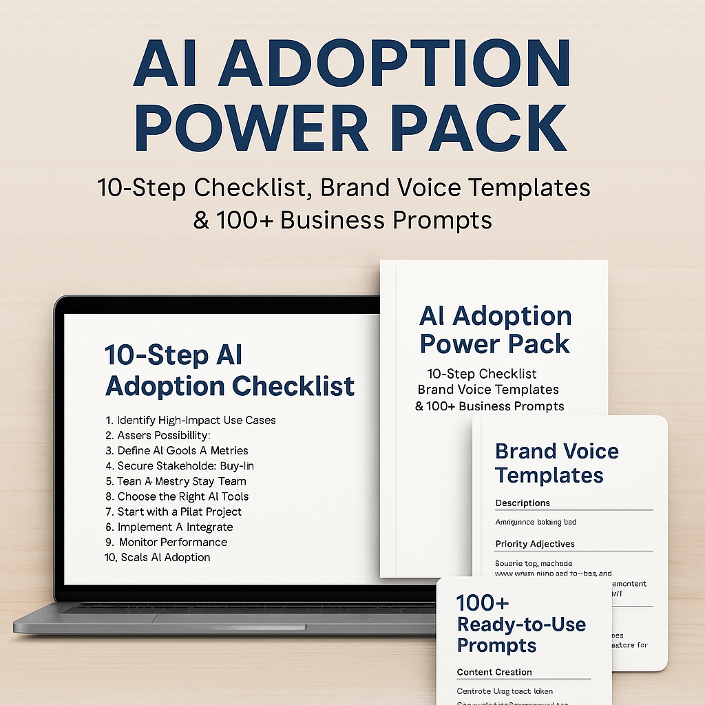 The AI Adoption Power Pack is your complete toolkit for integrating artificial intelligence into your business — without overwhelm or guesswork.