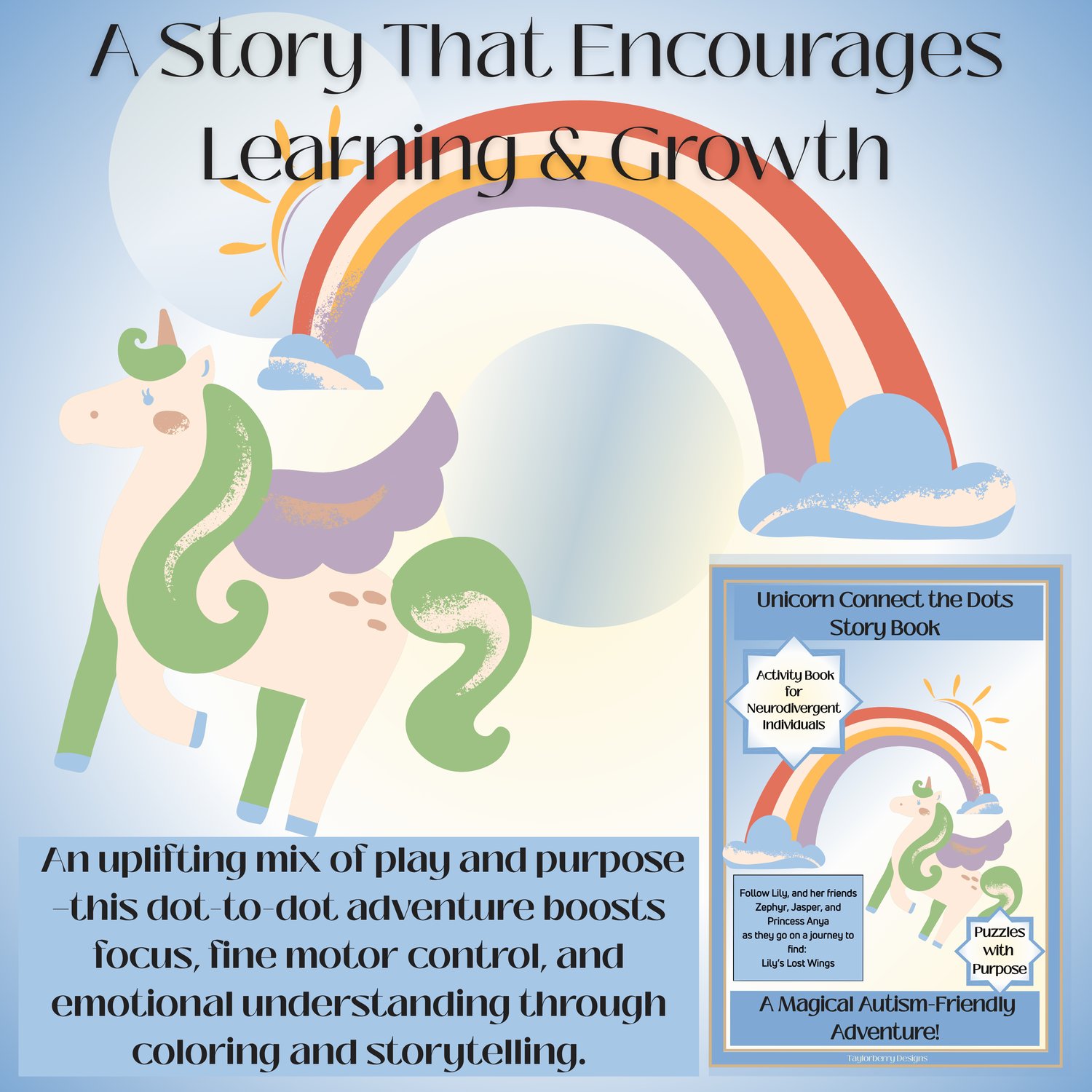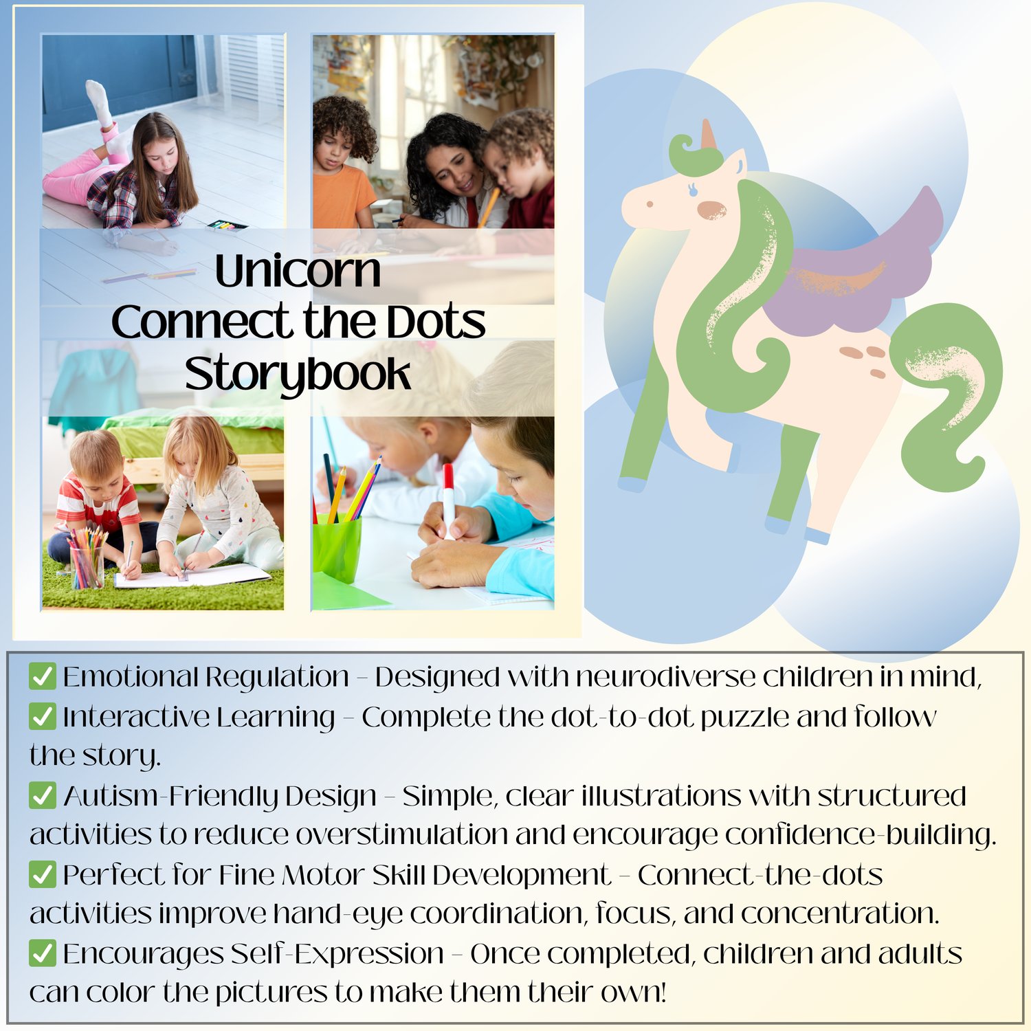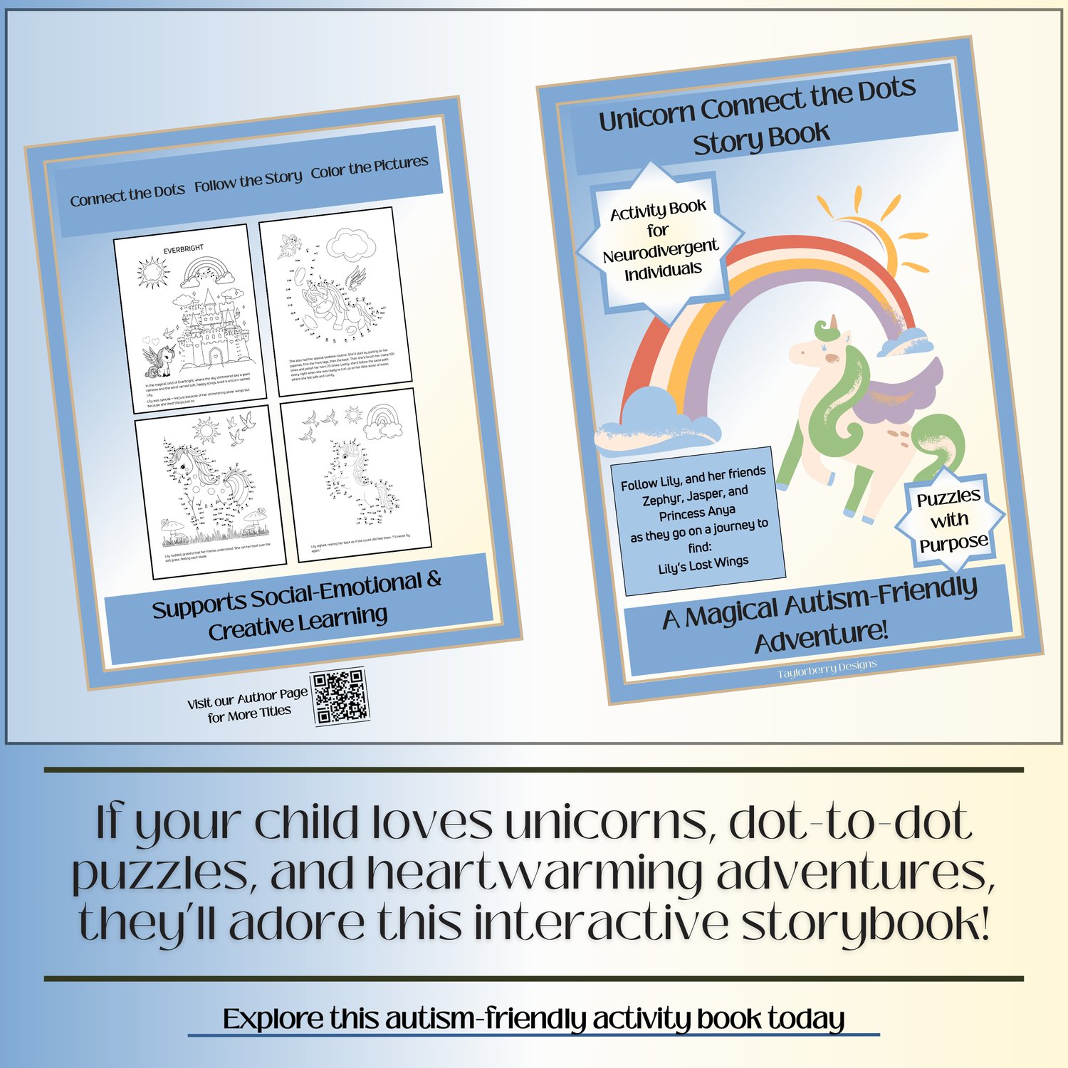 Step into a whimsical world where unicorns guide kids through gentle stories and sensory-friendly puzzles. Designed for autistic children ages 7+, this book blends dot-to-dot activities with storytelling and SEL prompts to spark creativity and emotional expression.