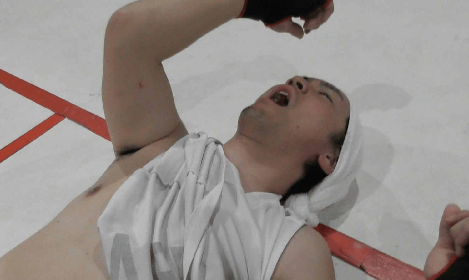 Daiki finishes his training with weight lifting. He is timestopped and later undress of his tank top, showing his tattoo. He is then put on the floor and frozen and unfrozen several times.