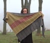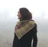 Sos is a simple asymmetric shawl, worked in alternating stripes of garter stitch and stocking stitch. The pattern begins by casting on just a few stitches, and increasing as you work. Slip stitch columns create vertical stripes through the shawl, before finishing with applied i-cord edging.