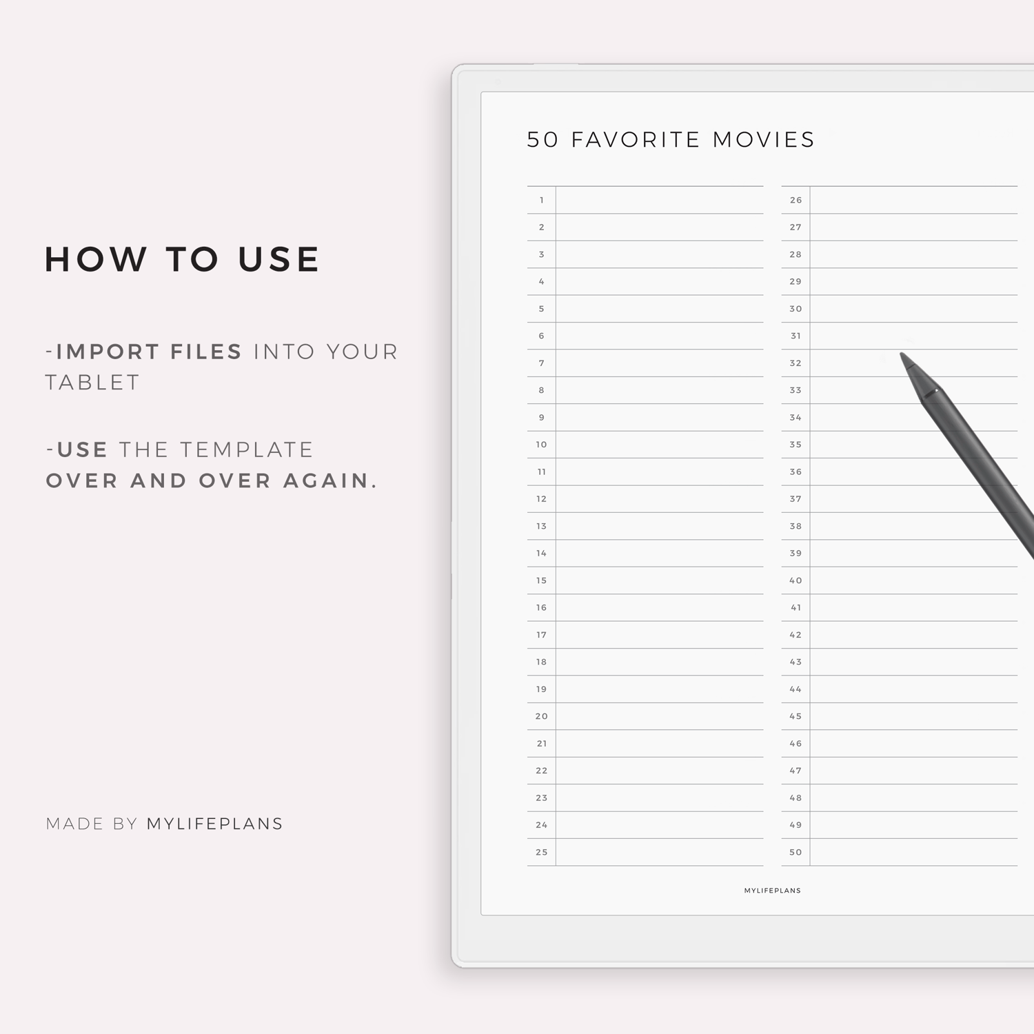 My Favorite Movies Template for Remarkable, Kindle Scribe, Boox, Supernote, Kobo