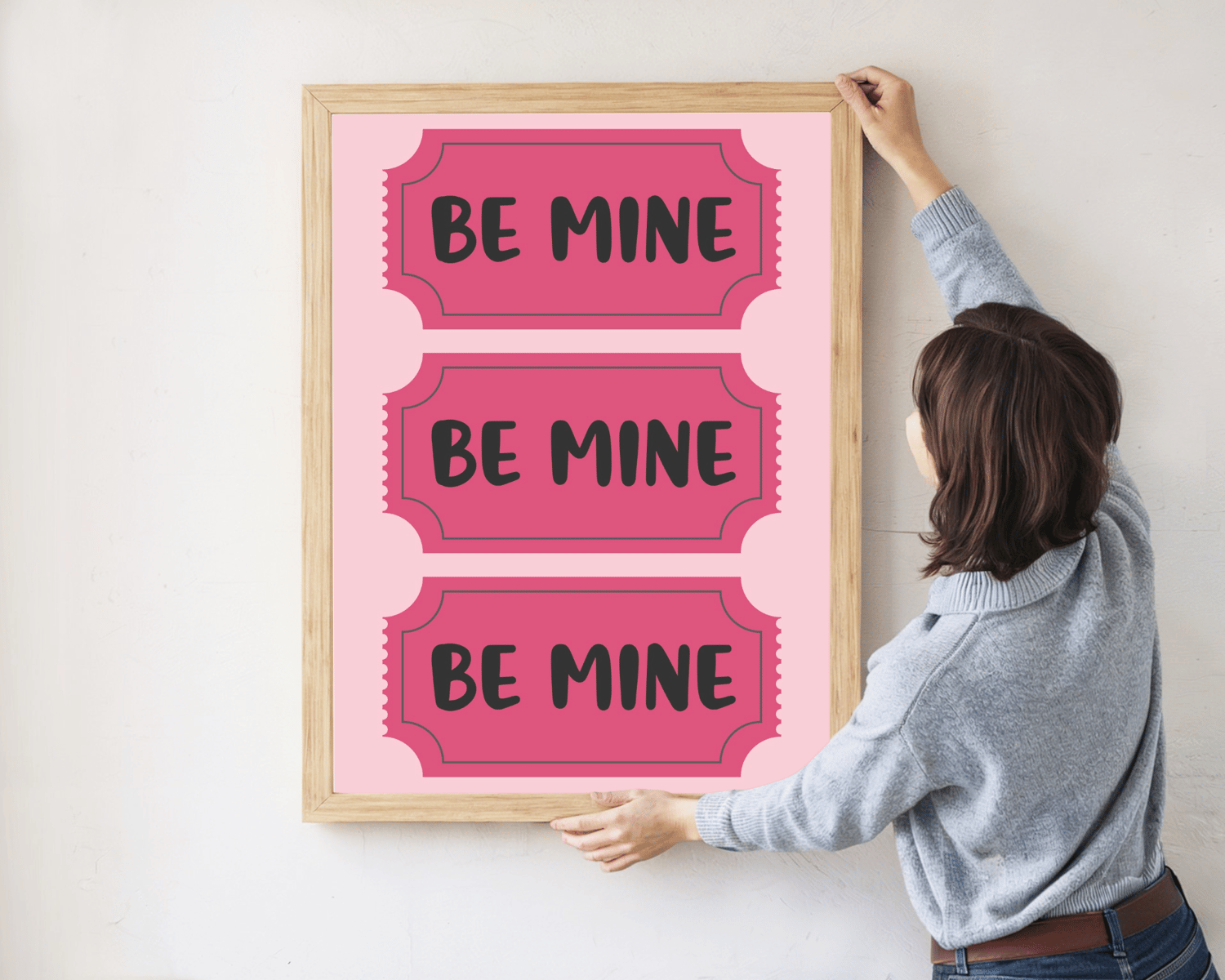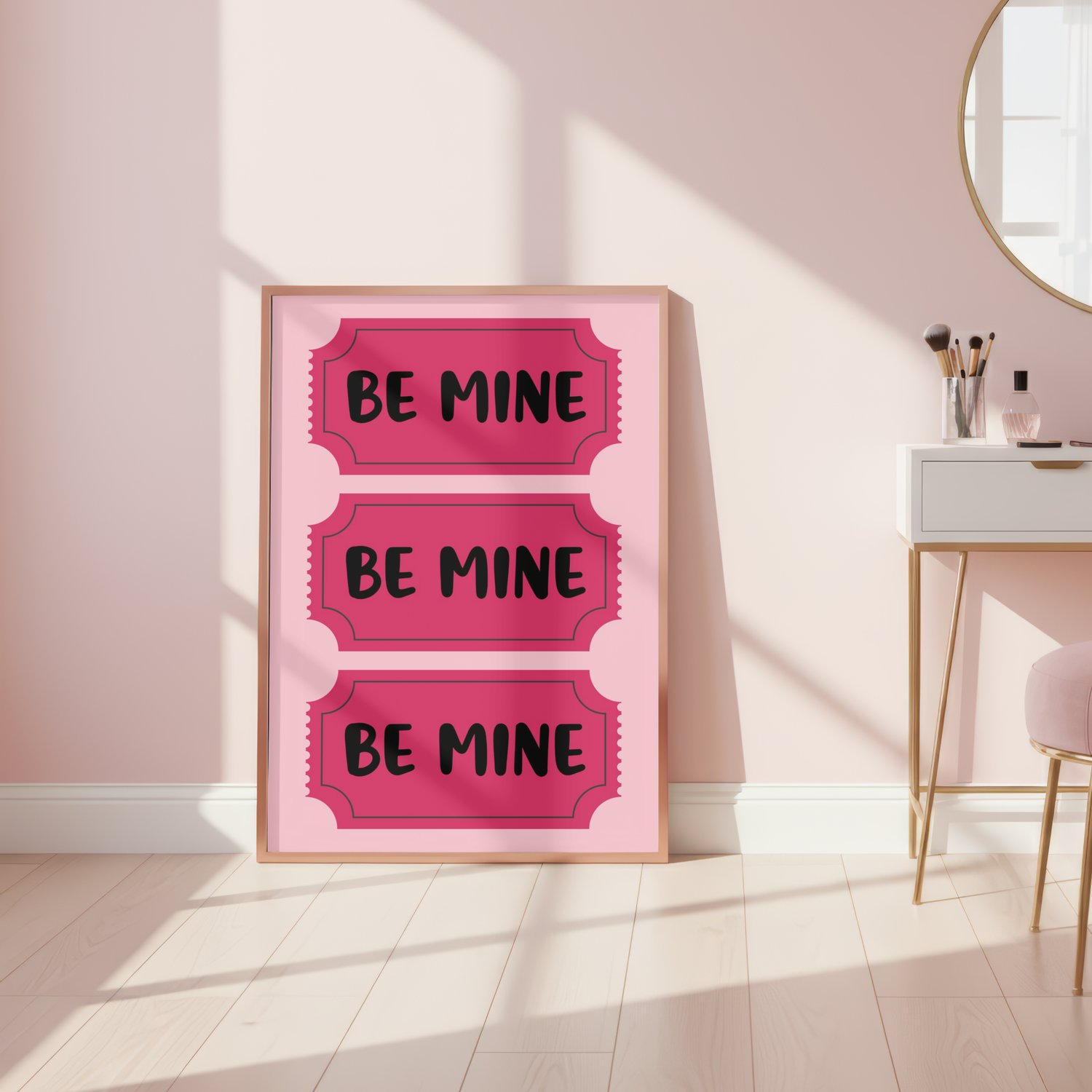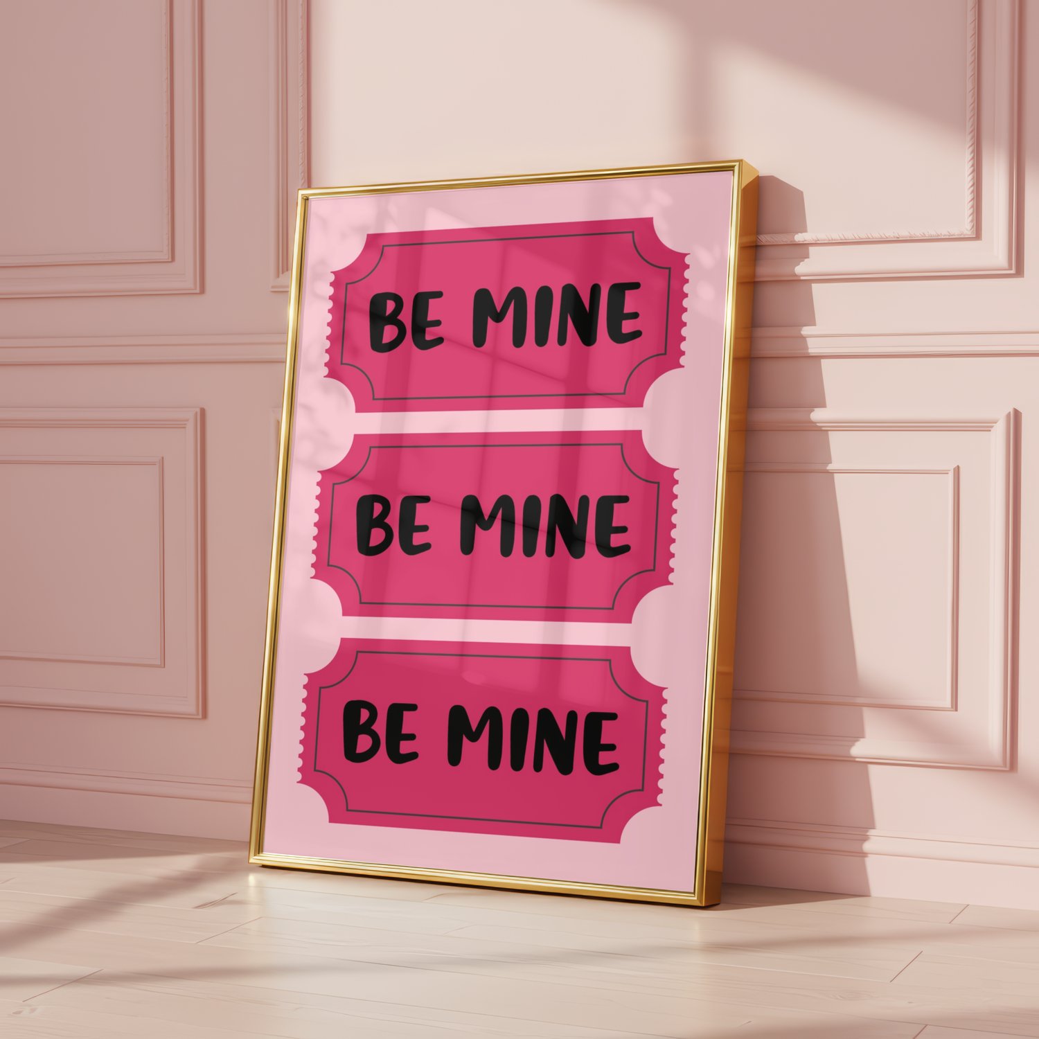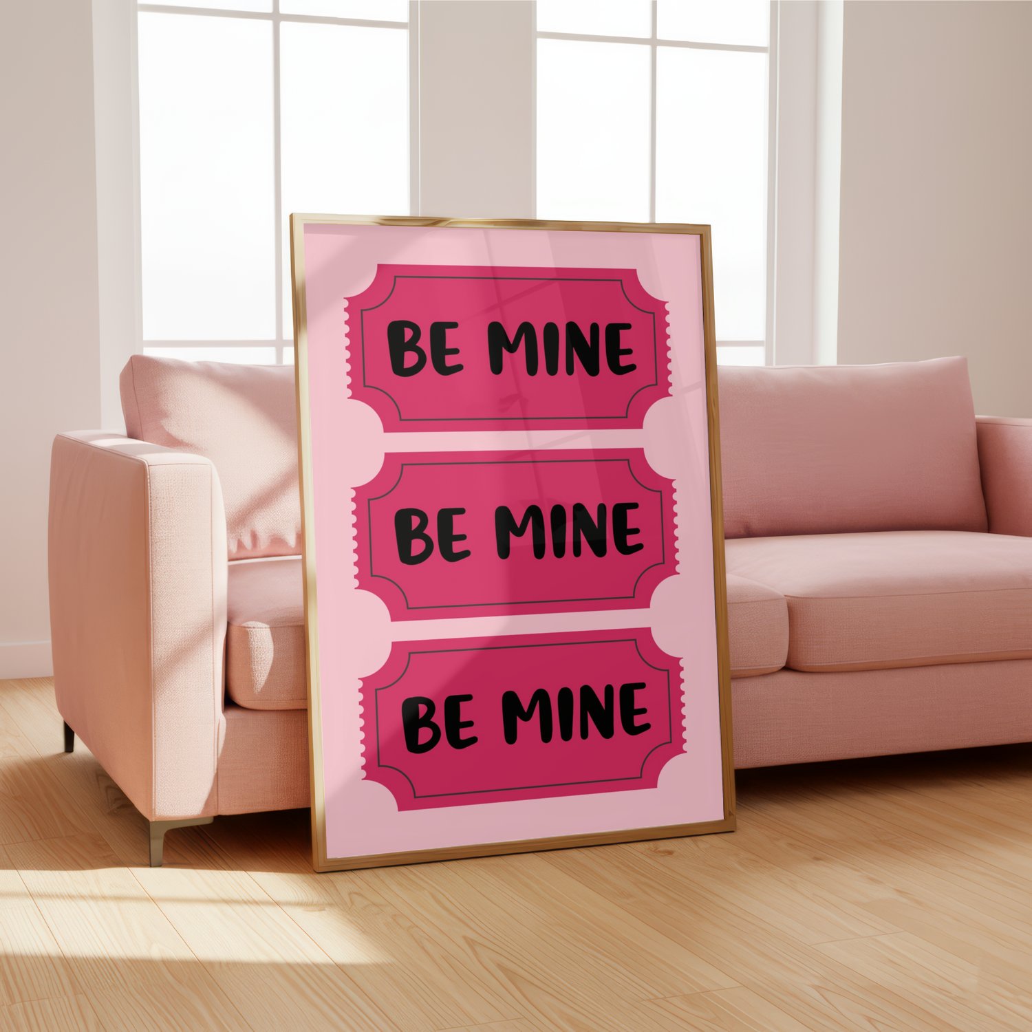 Add a sweet pop of pink to your Valentine’s Day decor with this “Be Mine” Valentine wall art printable. Designed in a fun ticket-style layout with soft pink tones, this digital print is perfect for bedrooms, nurseries, offices, dorms, or seasonal Valentine displays.