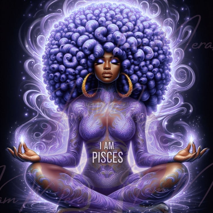 Embrace your uniqueness with the revolutionary "I Am Aquarius" Water-Bearer Queen digital artwork. Combined with innovation, confidence, and unapologetic self-expression, this digital diva is draped in powerful, futuristic symbols of collective transformation and individual genius.