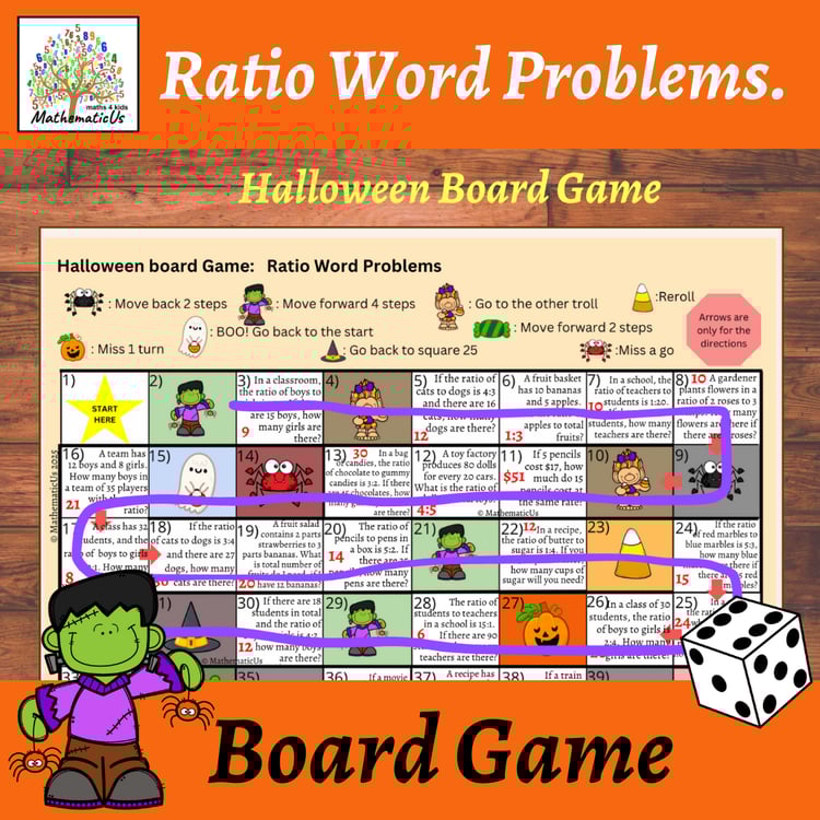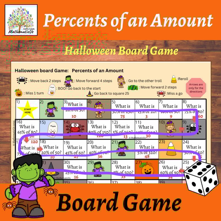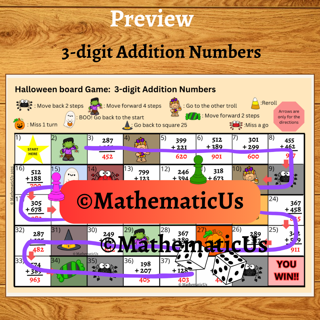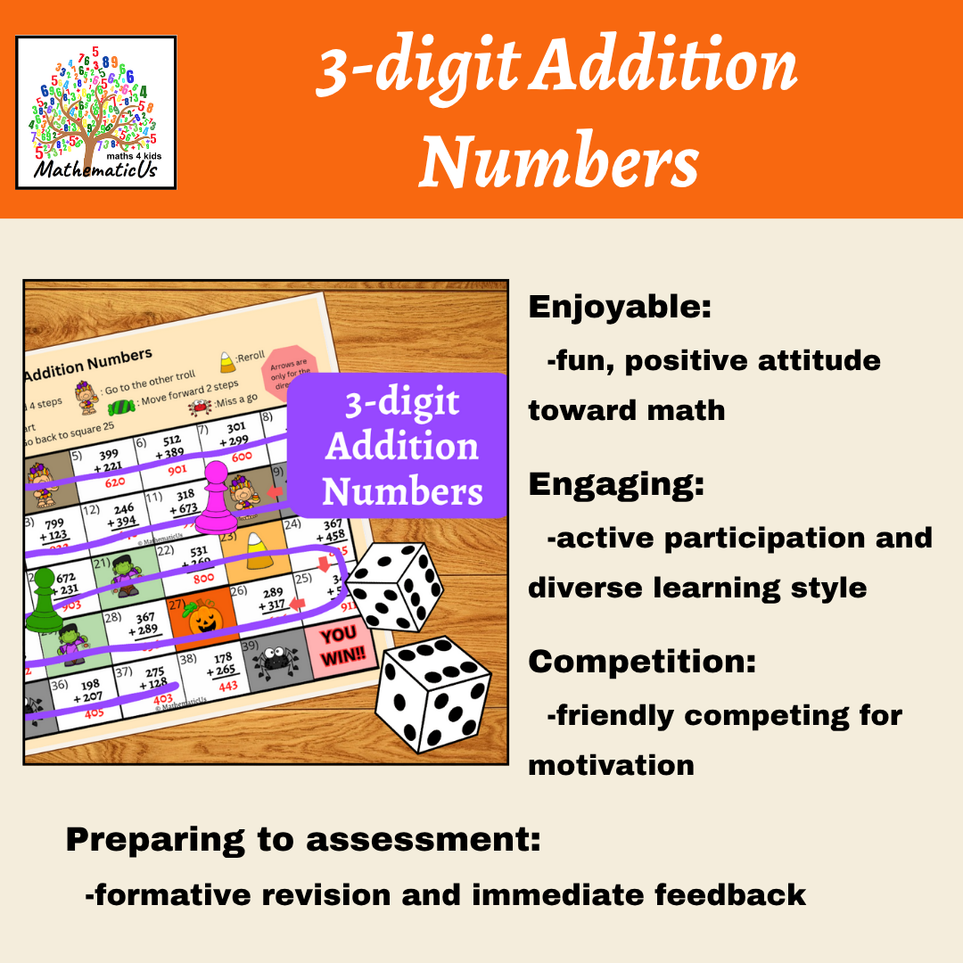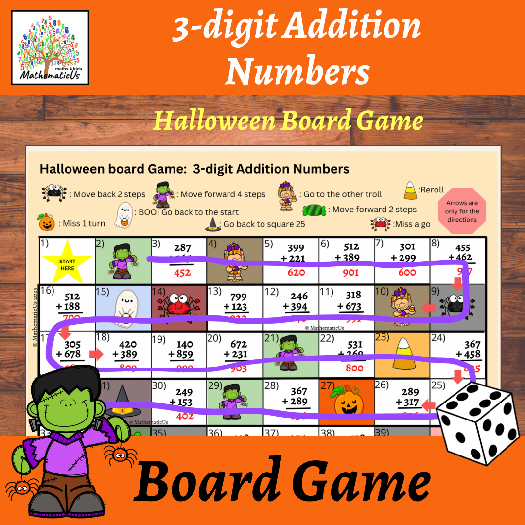 It is a Halloween board game. Children have to add 3 digits with regrouping. This math game is a great review and an engaging way to practice more in Addition 3-Digits. Children will have fun playing this dice game.
