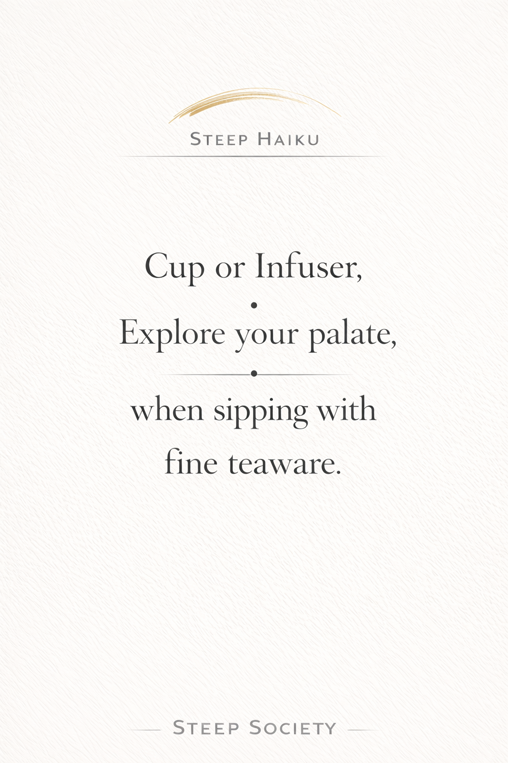 “Steep Teaware: Haiku #1” celebrates the simple joy of sipping with a cup or infuser, encouraging you to explore flavor and elevate the tea moment with fineteaware.