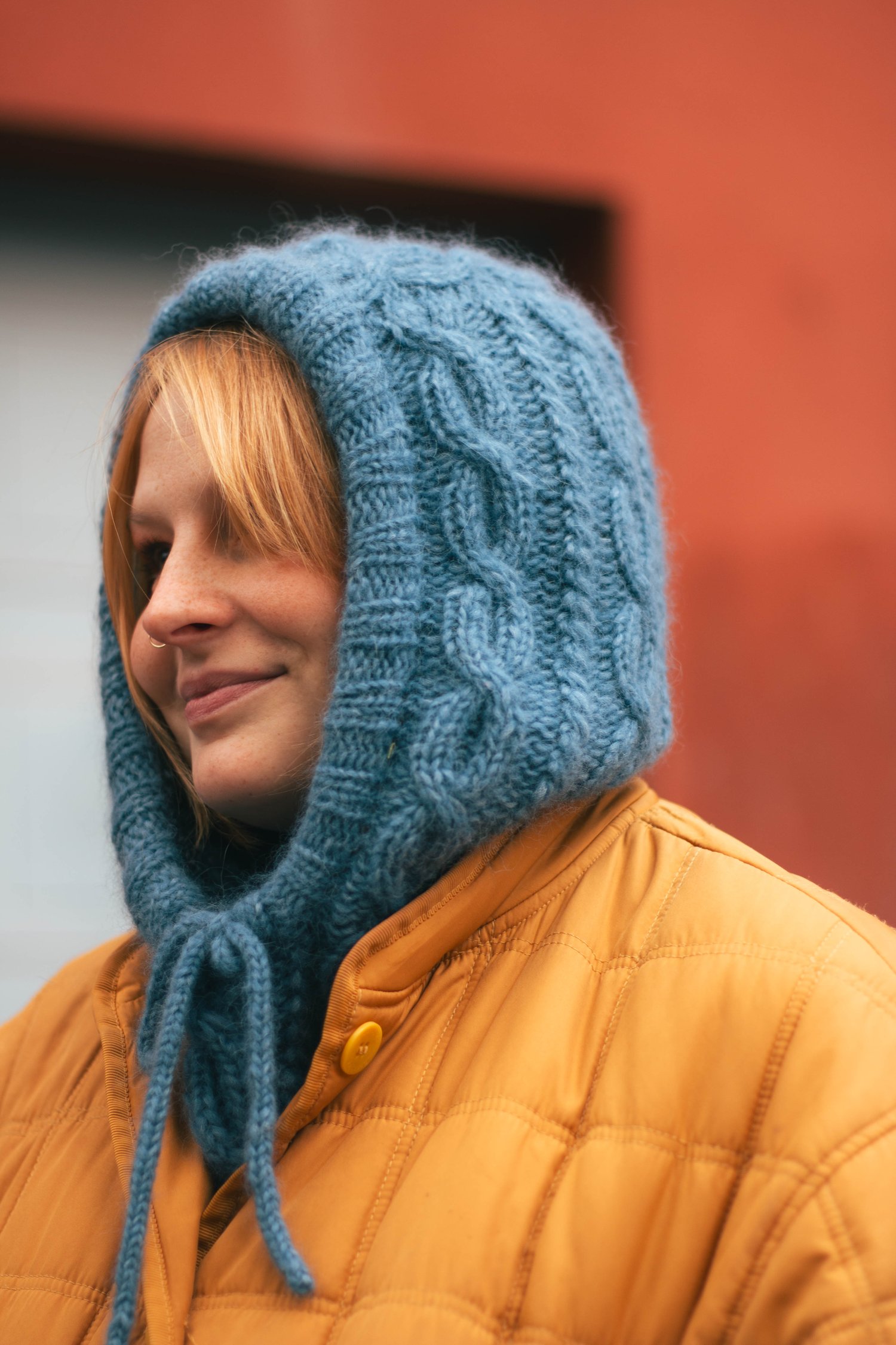 The hood is worked top-down, back and forth, while following a cable chart. I-cords are added to the lower edges, and the front edge is finished in ribbing, then folded to form a neat tube for the i-cord tie.