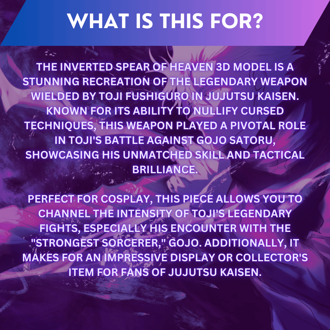 Embrace the power of the Inverted Spear of Heaven with this meticulously crafted 3D model prop, perfect for fans of Jujutsu Kaisen and Toji Fushiguro. This prop is designed to bring out every detail of the weapon's unique structure, making it an exceptional choice for cosplay and display.