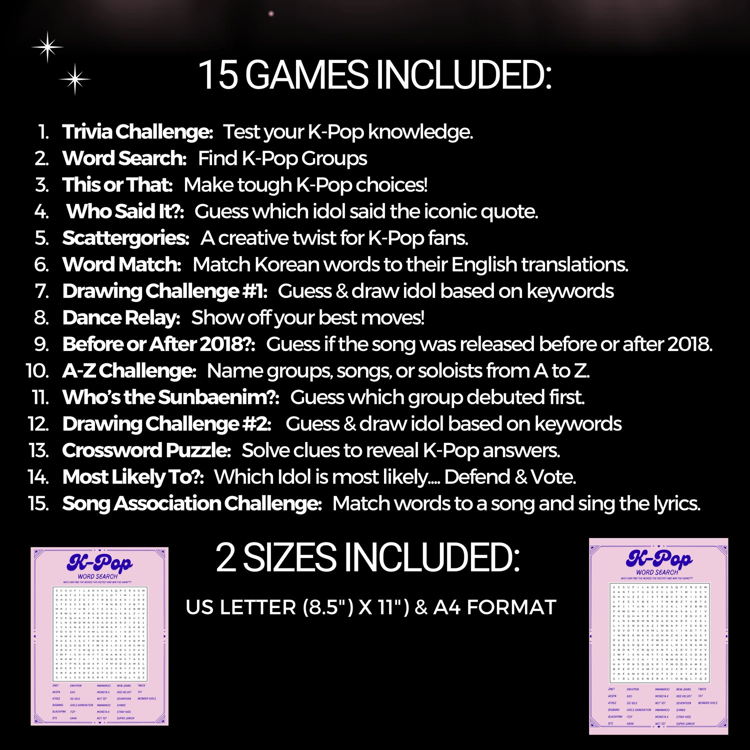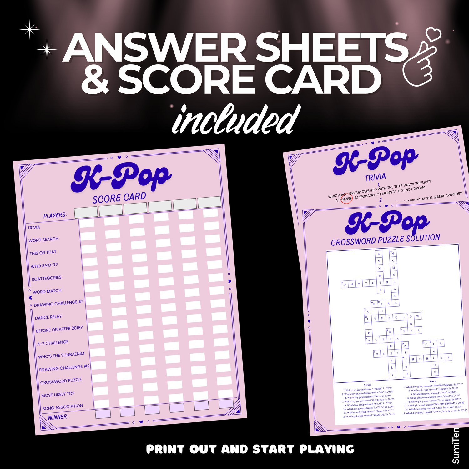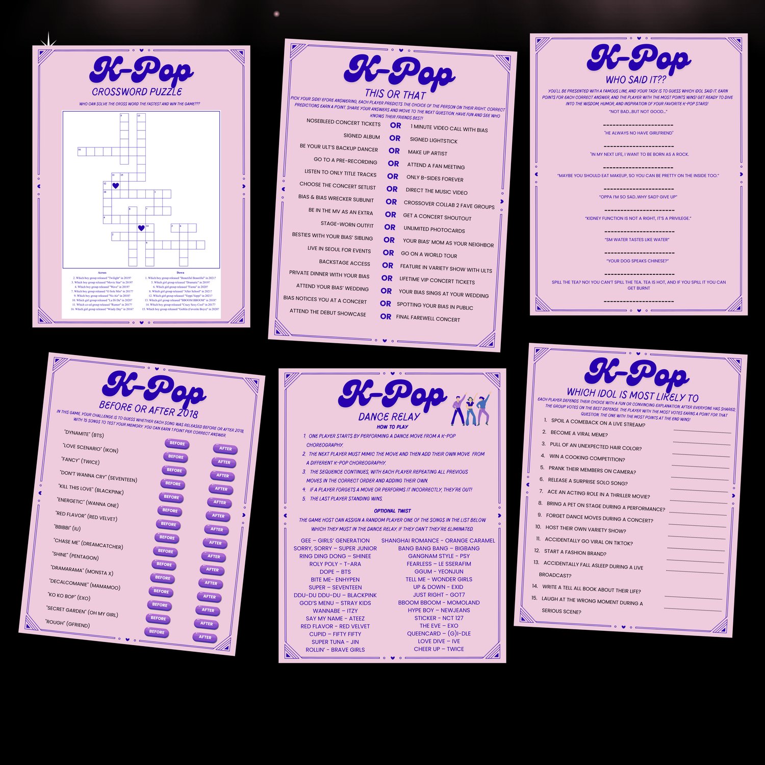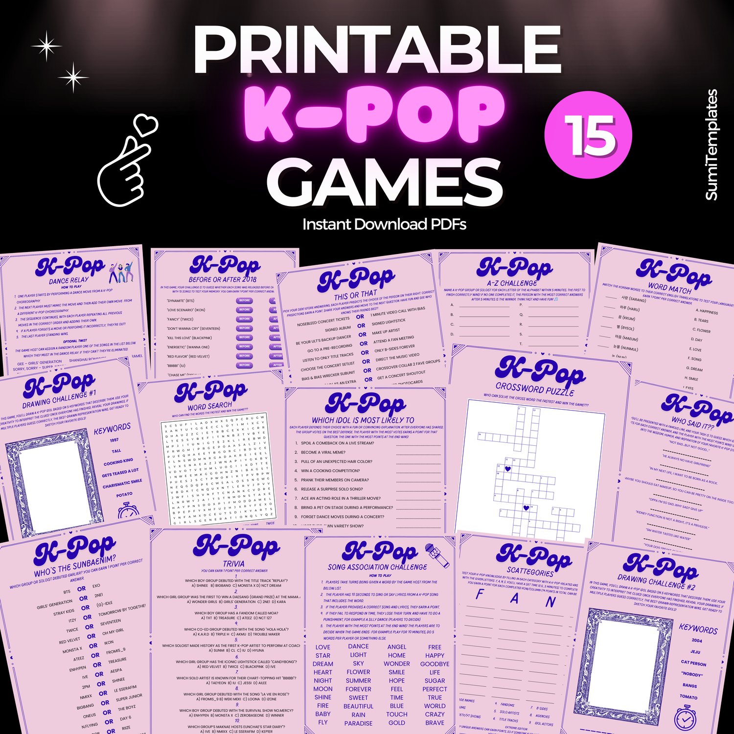 This bundle of 15 printable K-Pop games is perfect for parties, fan meetups, or just a fun night with friends. Packed with trivia, creativity, and fan challenges, these games are designed to celebrate your love for K-Pop idols, songs, and choreographies while creating unforgettable memories!