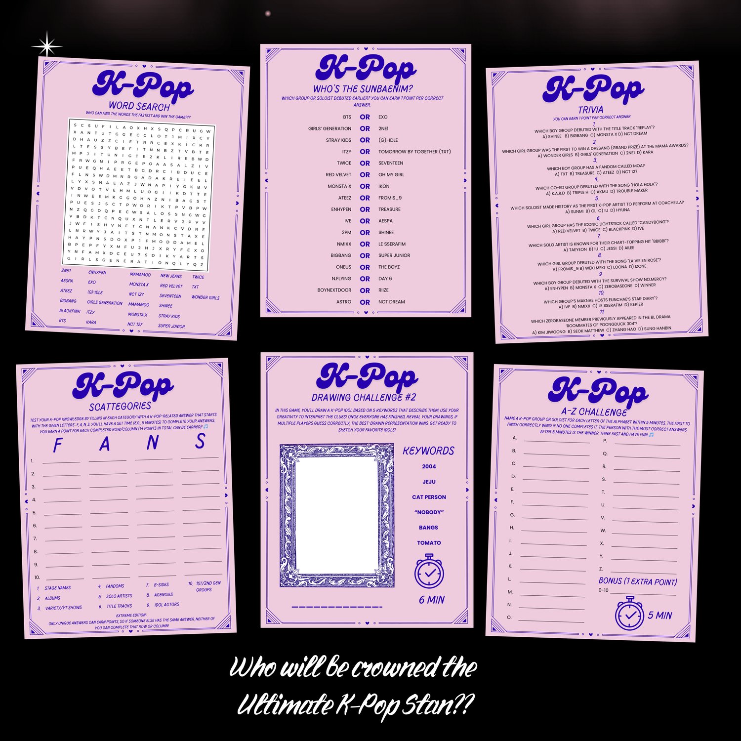 Perfect for K-pop fans of all ages and knowledge levels. Who will be crowned the Ultimate K-Pop Stan? A great icebreaker for parties, game nights, and K-pop gatherings.