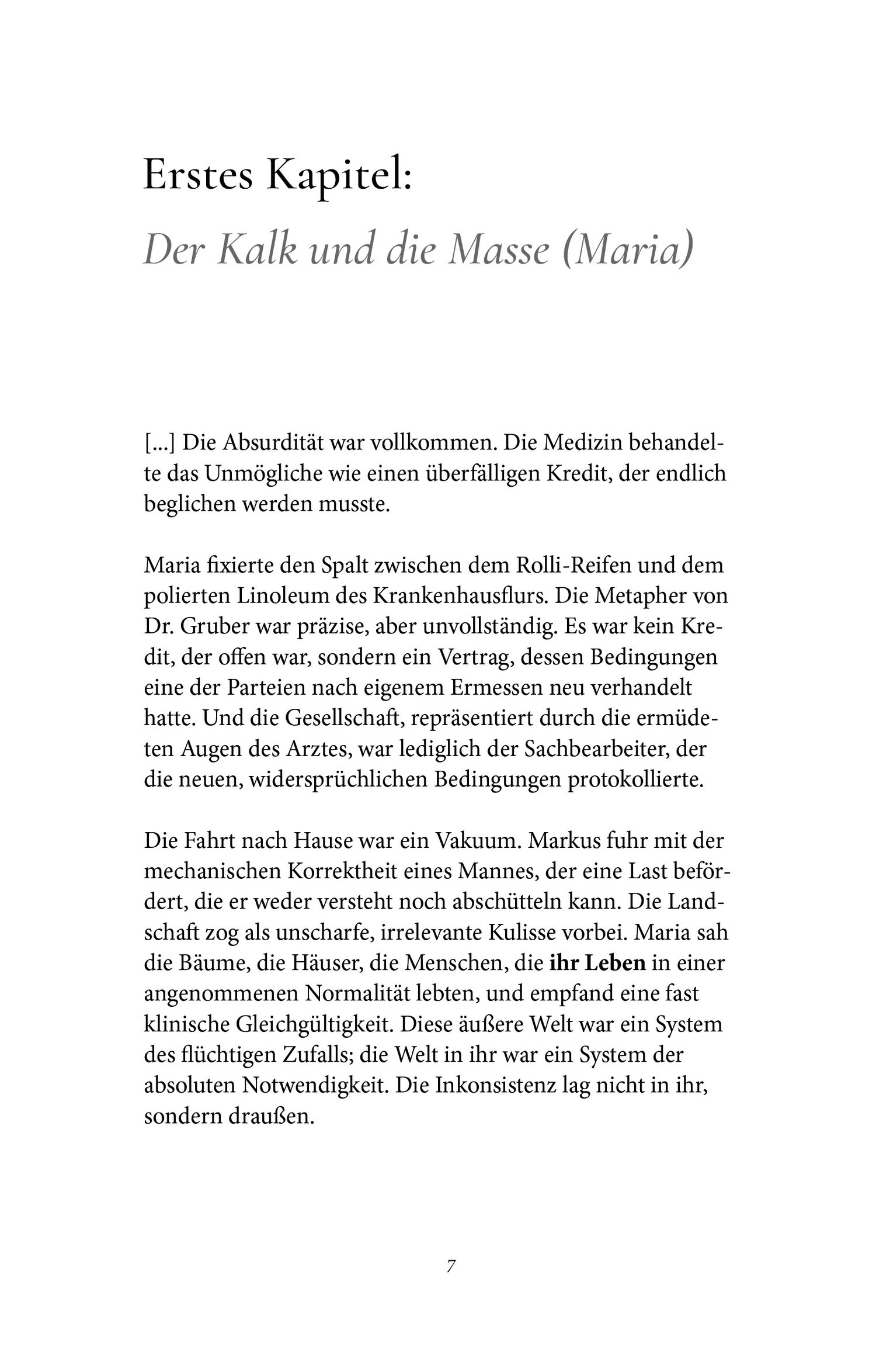 Maria Krenn ist seit Jahren schwanger. Doch das, was in ihr wächst, ist kein Kind mehr. Der Fötus verweigert jede Form des Lebens. Er zieht sich zurück und verfestigt sich zu einem kalten, mineralischen Monolithen—einem Makel der Natur, der wie Kalk im Inneren ihrer Existenz wächst.