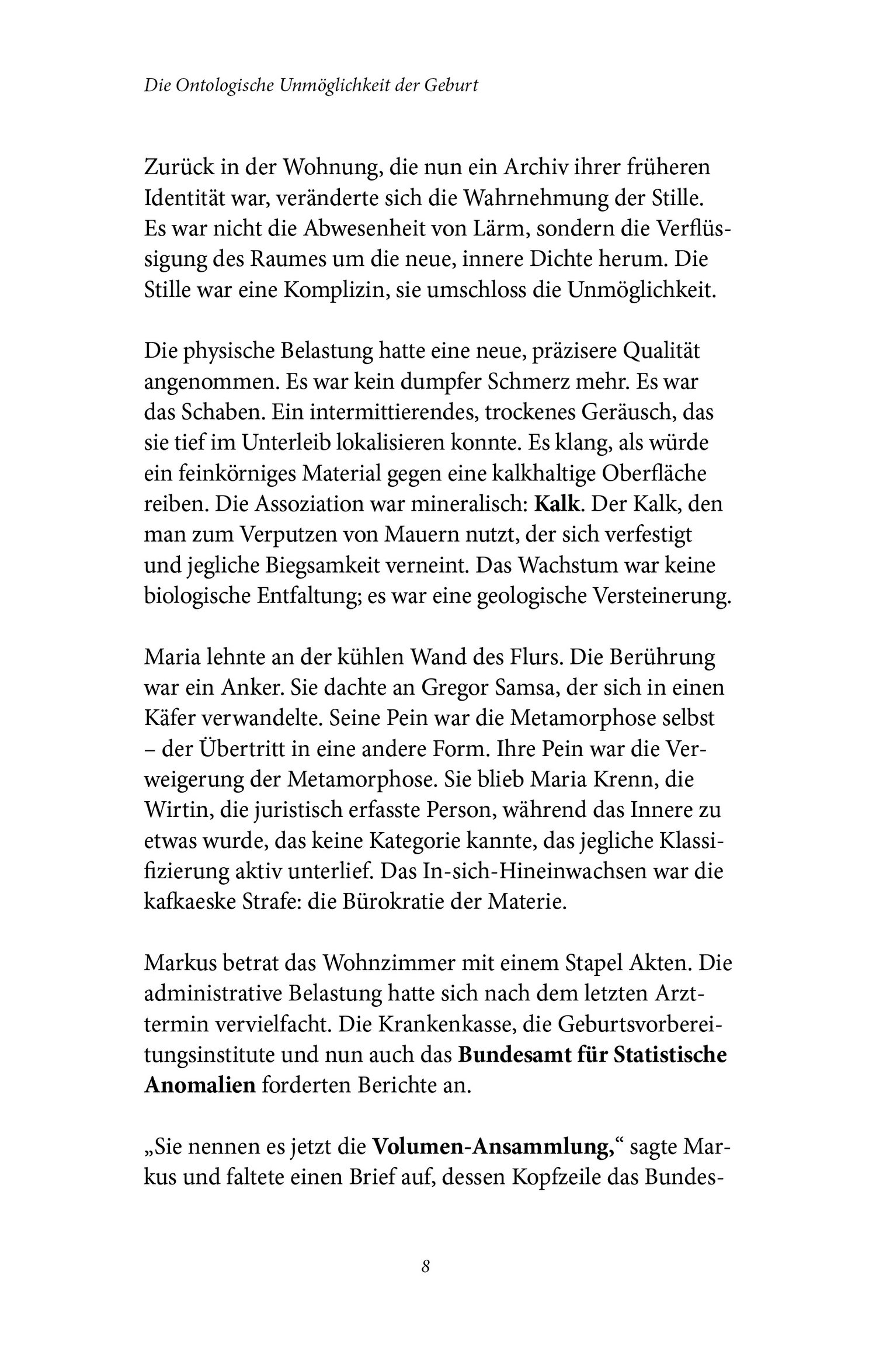 Die Verwaltung der Geburt ist eine kafkaeske, klinische und philosophische Horrornovelette über die Reduktion des Menschen auf Funktion, das Ersticken von Bedeutung in Formularen und die kalte Logik einer Welt, in der selbst das Grauen bürokratisch erfasst wird.