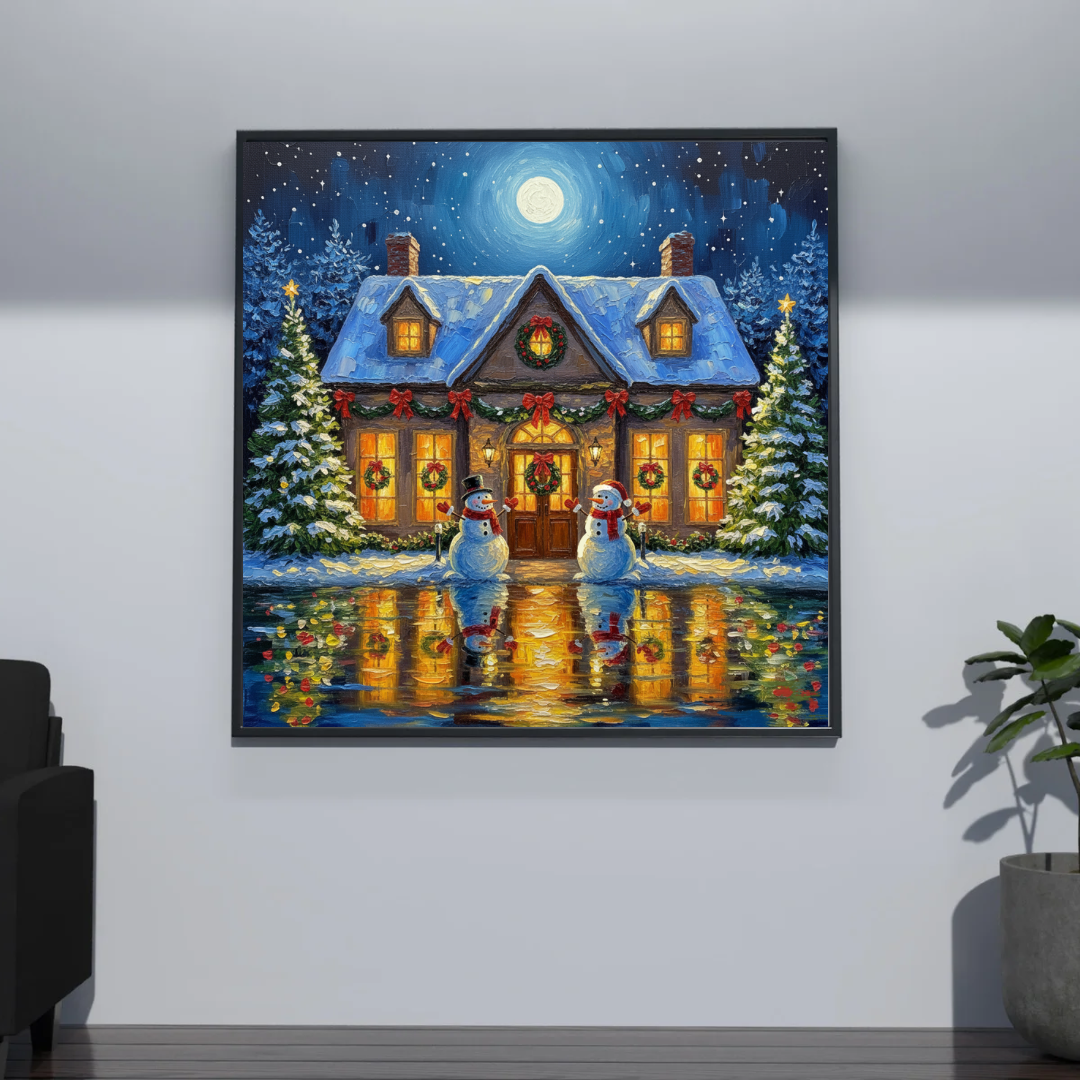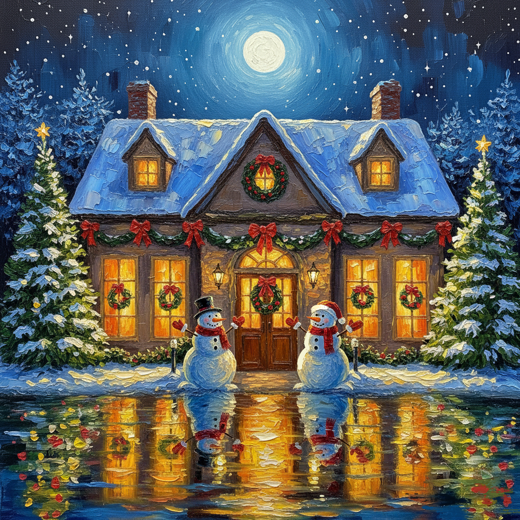 This is a detailed oil painting depicting a cozy, snow-covered house decorated for Christmas on a clear, moonlit winter night. Two large snowmen stand by the front door, wearing hats and scarves. The warm yellow light spilling from the windows and decorations is brightly reflected on the icy or wet ground in the foreground.
