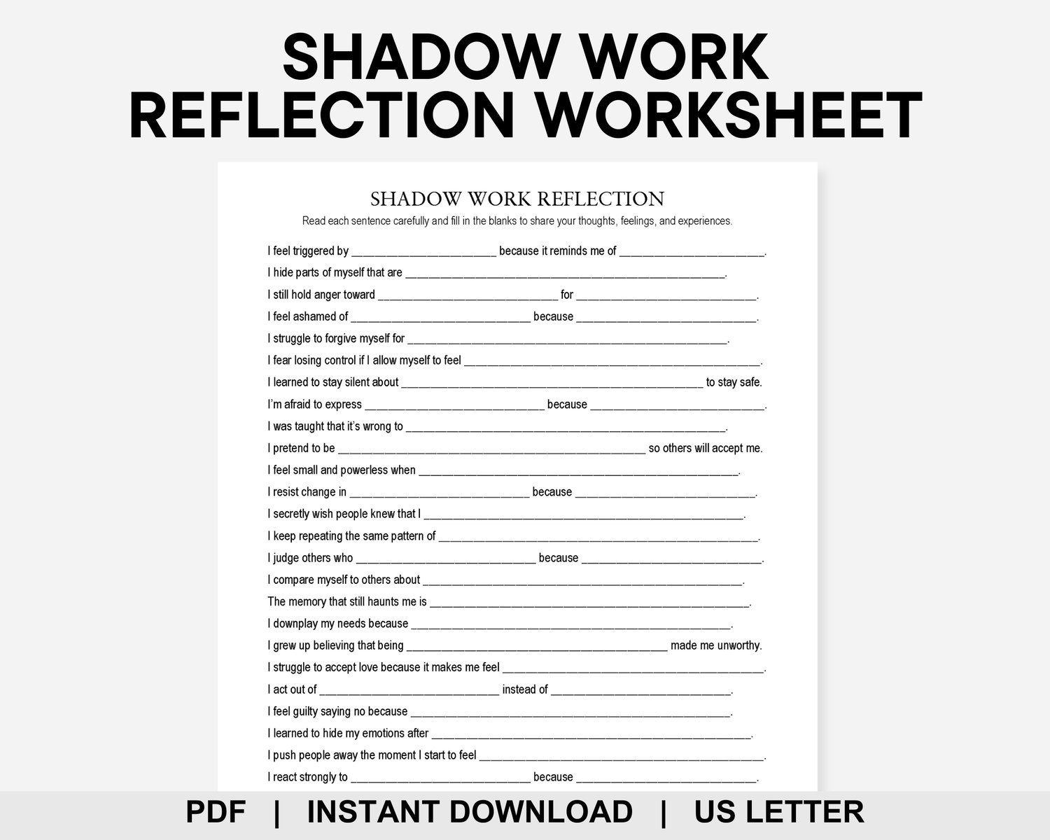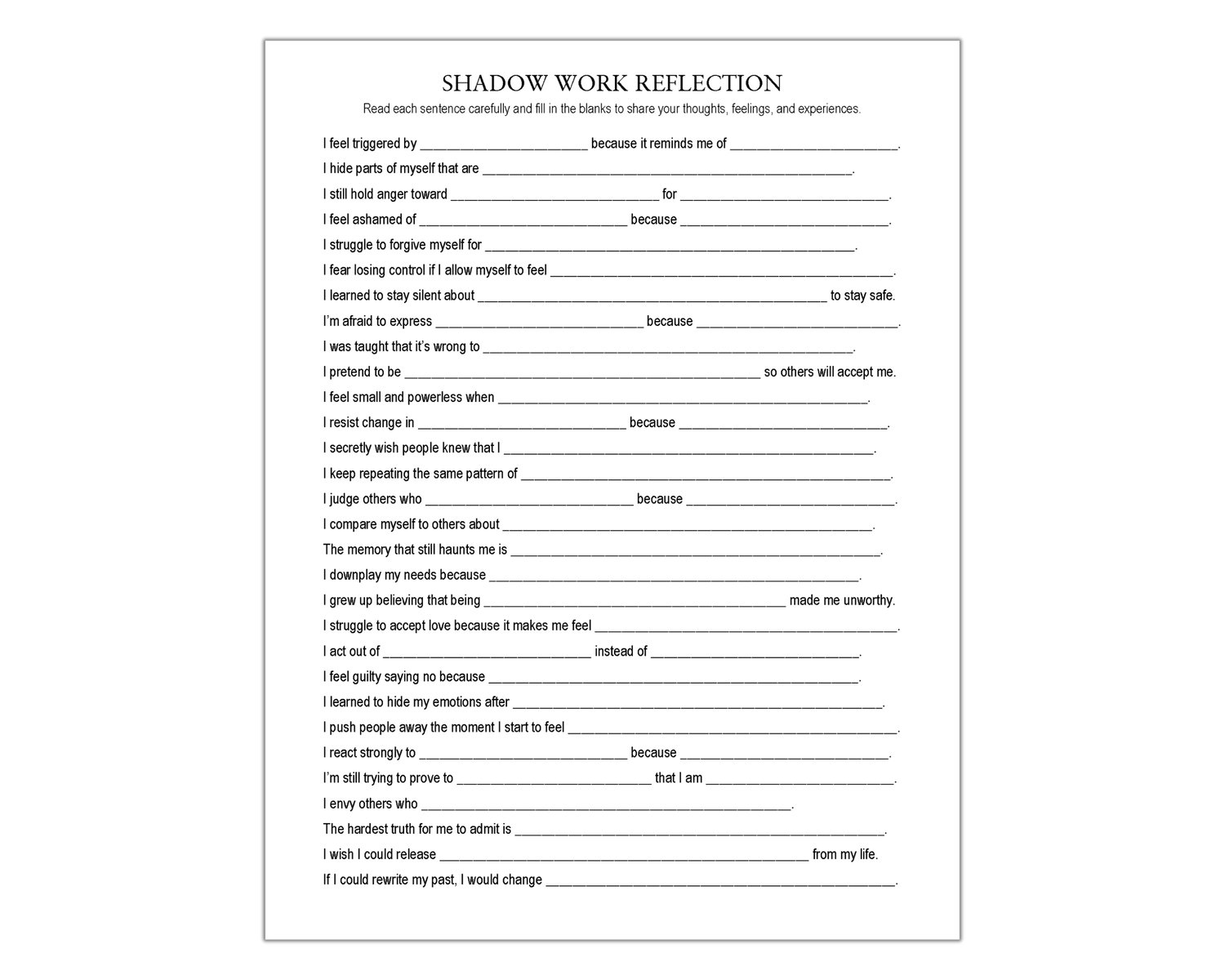 Ready to connect more deeply with your inner world? This Shadow Work Reflection worksheet features 30 prompts that help you explore hidden emotions, patterns, and beliefs at your own pace. Use it when you want to pause and check in with yourself. Choose to move forward on your journey of personal growth and healing.