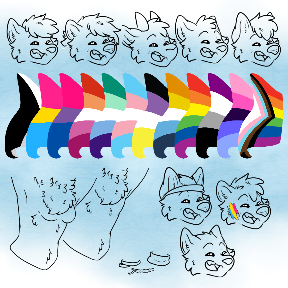 Comes with multiple hair style, accesories, multiple flags & base to draw your own. Fem and Masc body type, features for canine, feline, racoon, goat and bear specie.