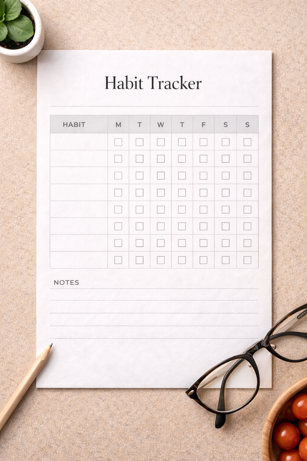 A minimalist monthly habit tracker designed to help you build healthy routines with clarity and consistency. This clean printable is perfect for tracking daily habits without pressure, keeping your wellness journey simple and intentional.