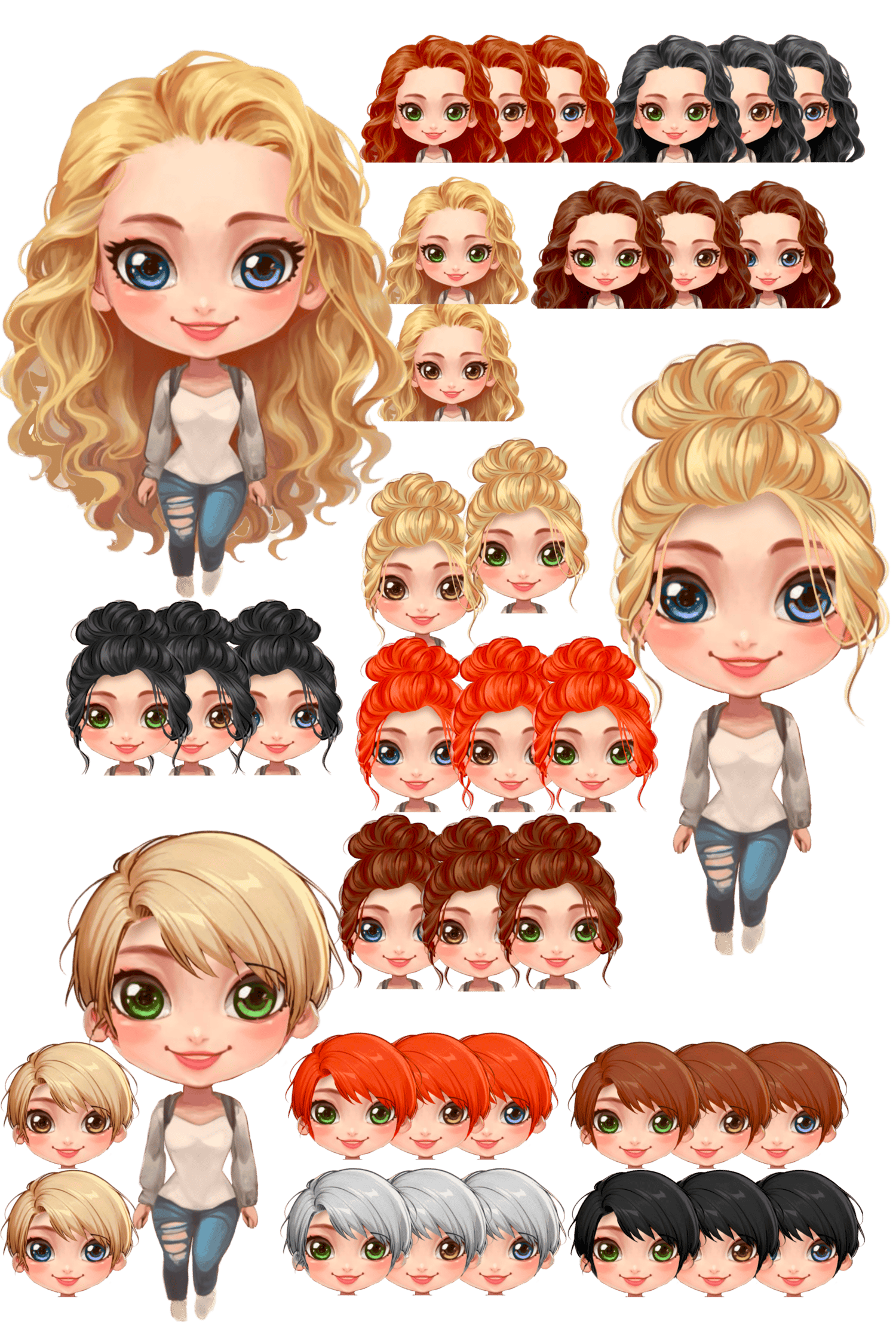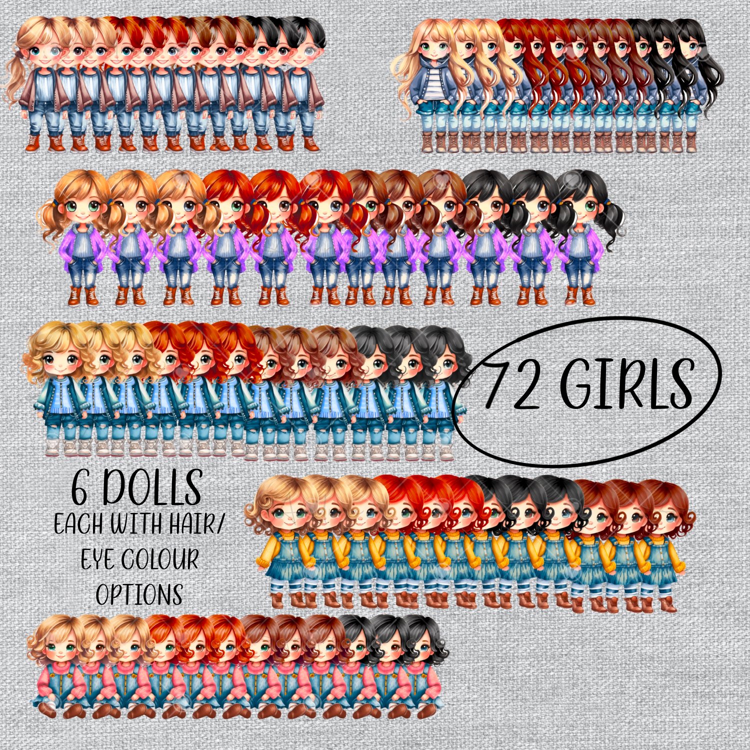 39 female complete dolls. 3 hair style options; long curly, messy bun and short. Each hair style has 4 colours; blonde, brunette, redhead and black. The short haired girls also have a grey option. Each hair style and colour also comes with blue, green and brown eyes.