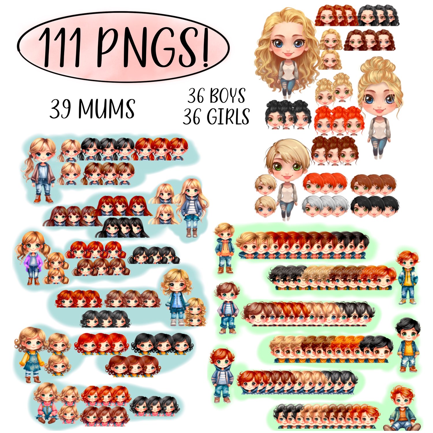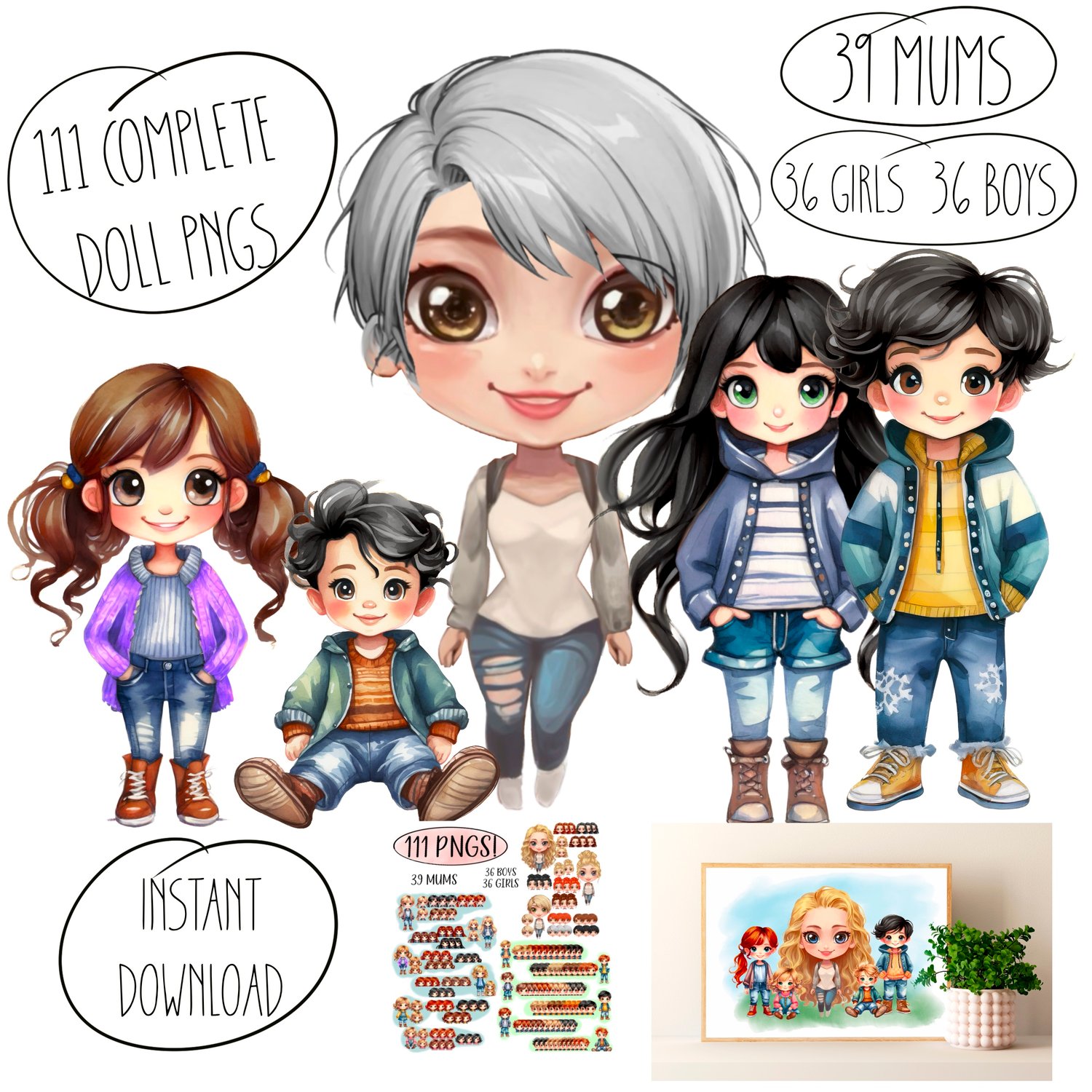 Huge Chibi doll bundle which includes mums, girls and boys. I've even included a grey haired woman option to use for grandma's etc. Each doll is ready-made. Over 100 files.