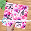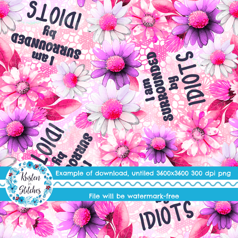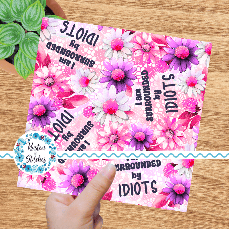I Am Surrounded By Idiots, with bright pink and purple daisy flowers.
