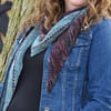 Being knit on a bias, this shawl blocks out to about 85” wide, lots of length to drape around your neck or shoulders.