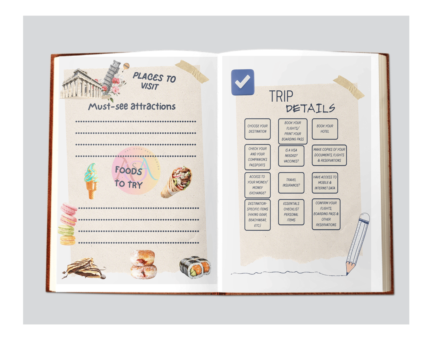 - Travel Journal Pages — Reflect on your favorite moments, thoughts, and emotions during your trip.