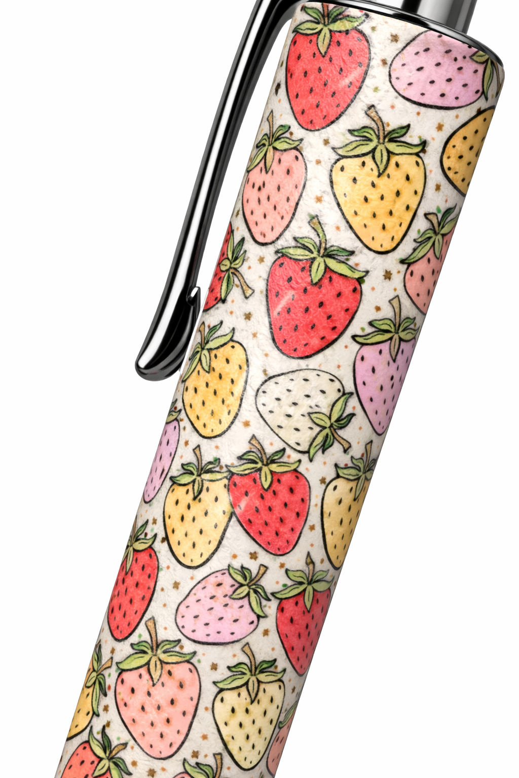 This adorable design features colorful strawberries in soft shades of pink, red, yellow, and white with delicate details, giving your pens a fun and playful look.