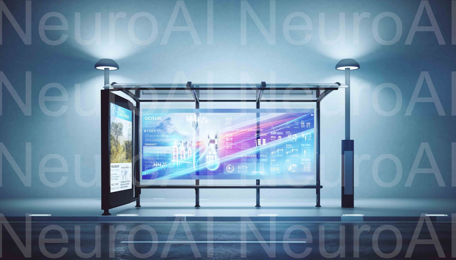 Futuristic bus stop with glowing digital display