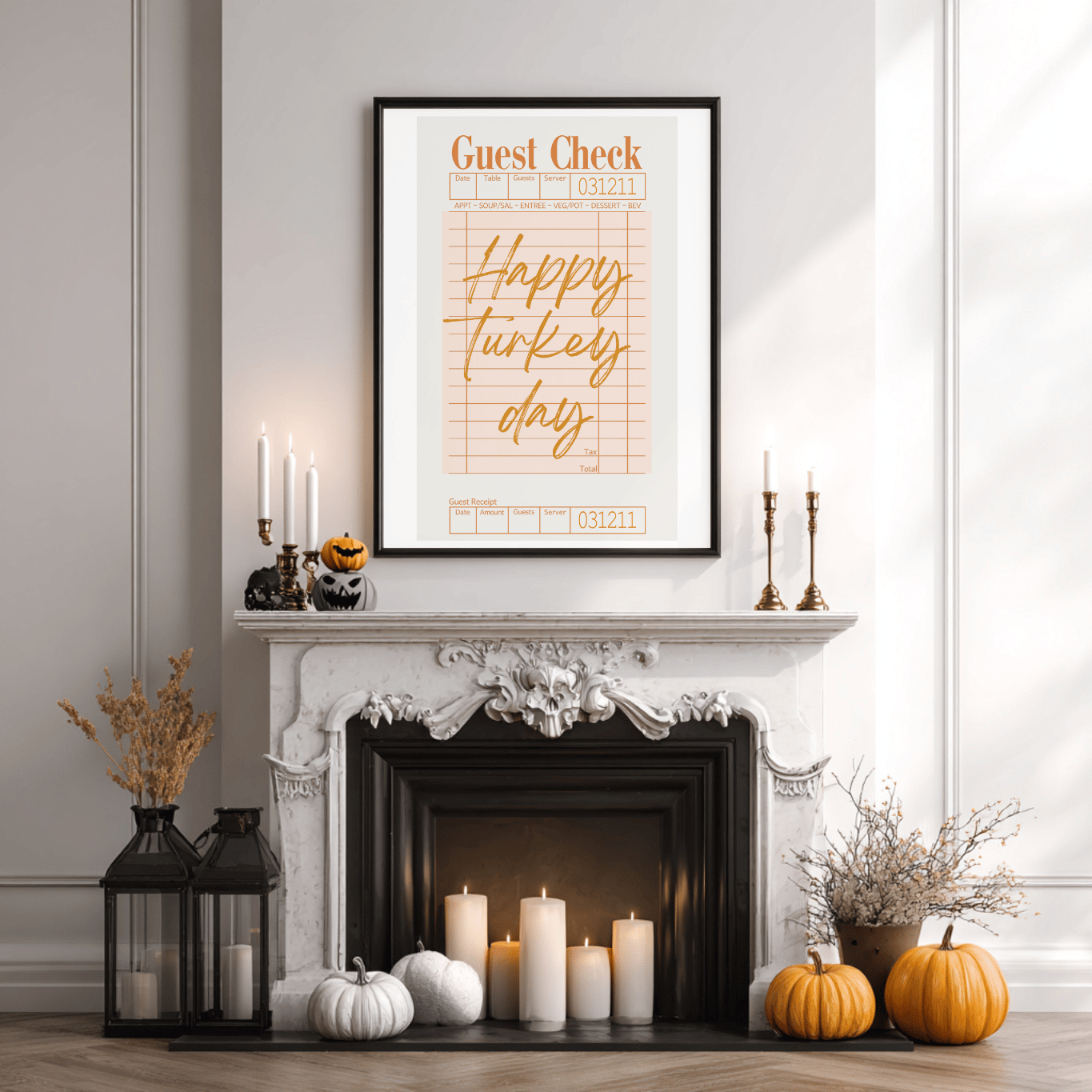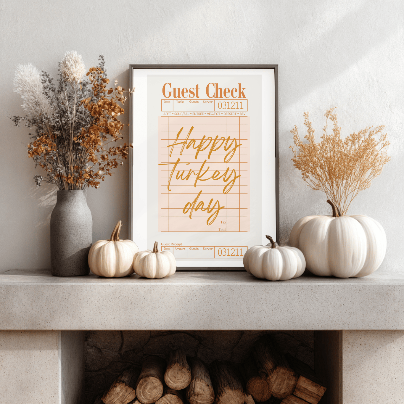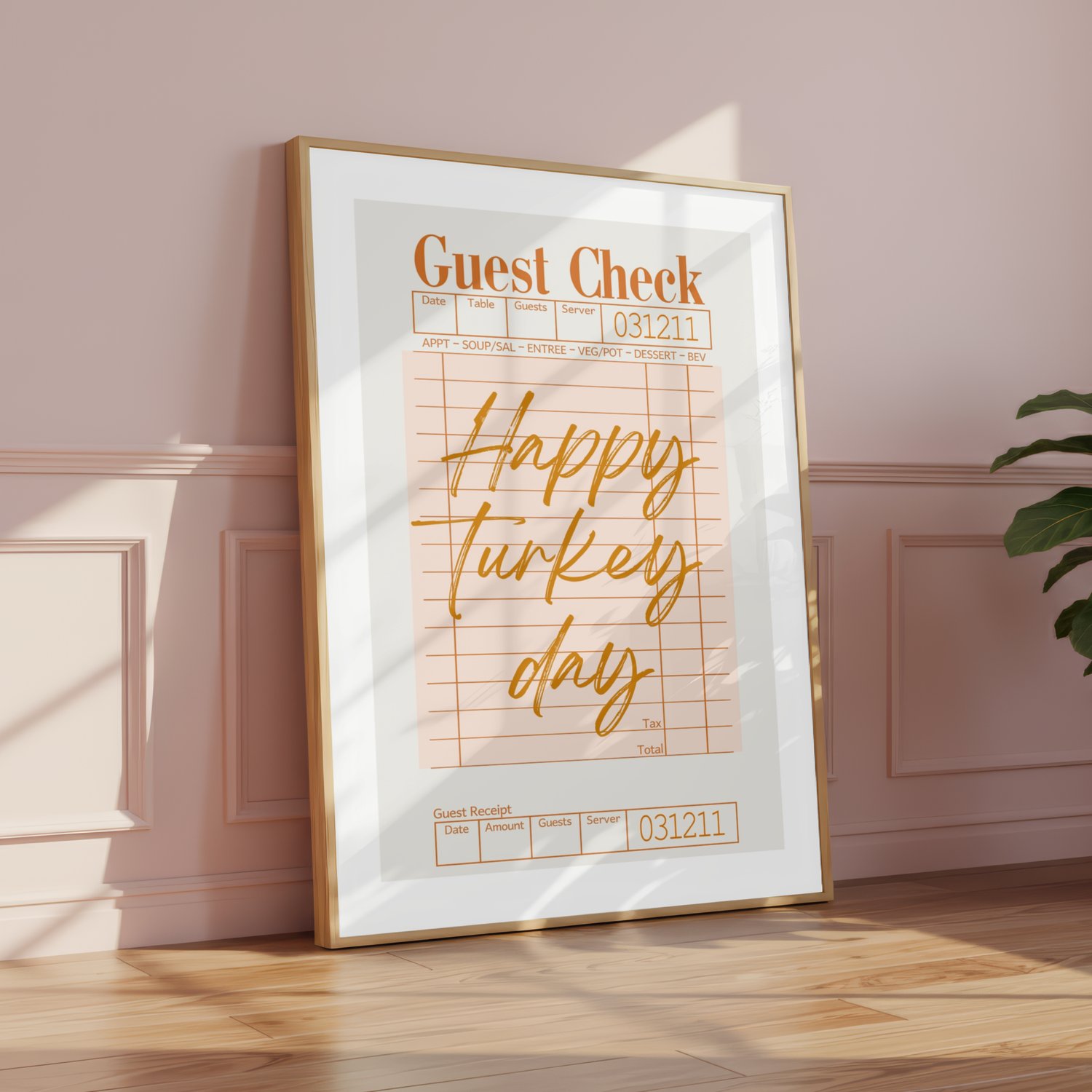 Bring some humor and vintage charm to your Thanksgiving decor with this “Happy Turkey Day” Guest Check Printable! Featuring a retro restaurant ticket design in warm fall tones, this artwork is perfect for adding cozy, playful vibes to your kitchen, dining room, or Thanksgiving gathering space.