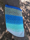 (The above 4 pictures feature a cowl in blues and greens, with four distinct stitch sections including a section of blue/yellow mosaic at the top, either modeled by me or displayed on a tree branch)
