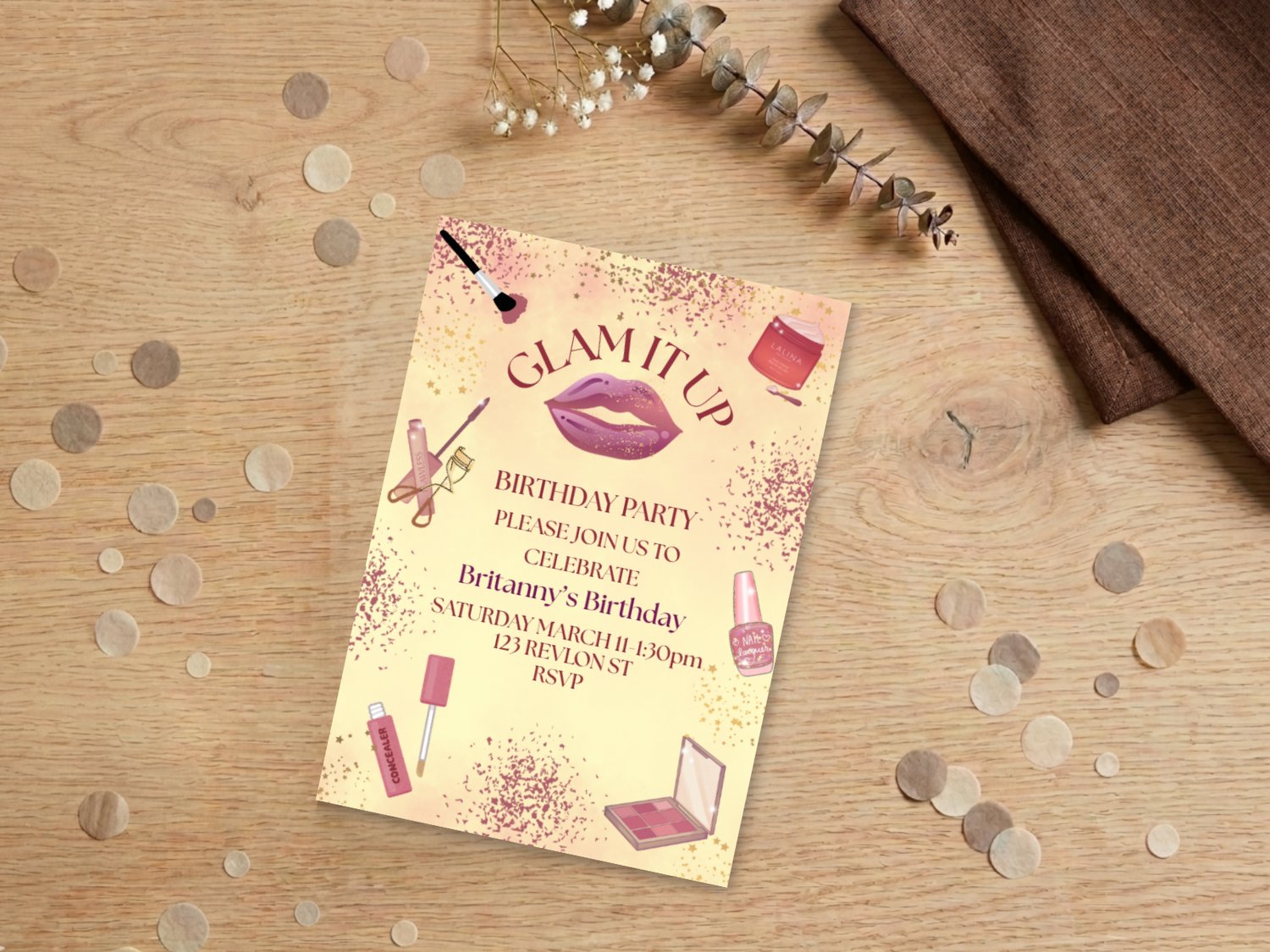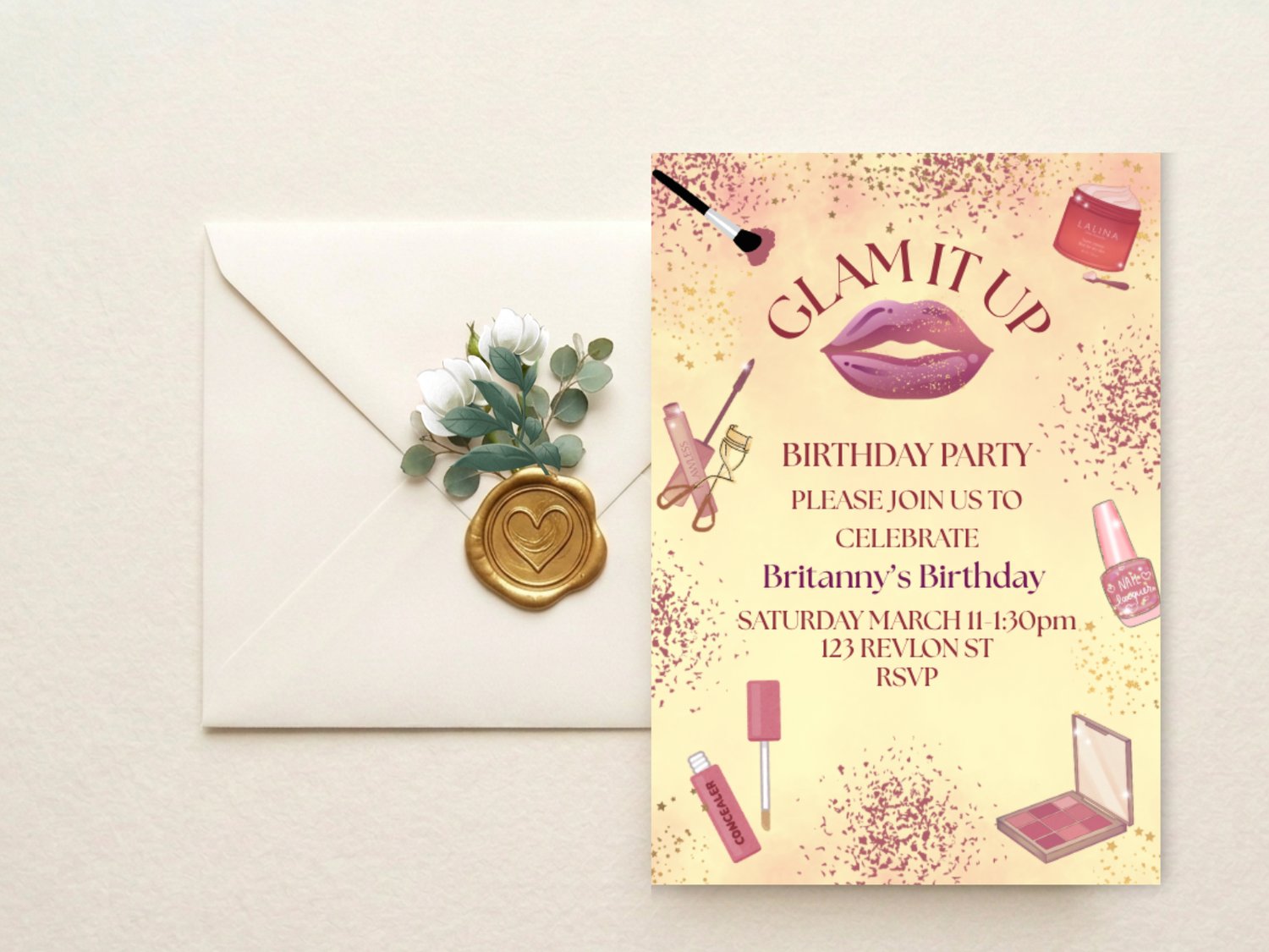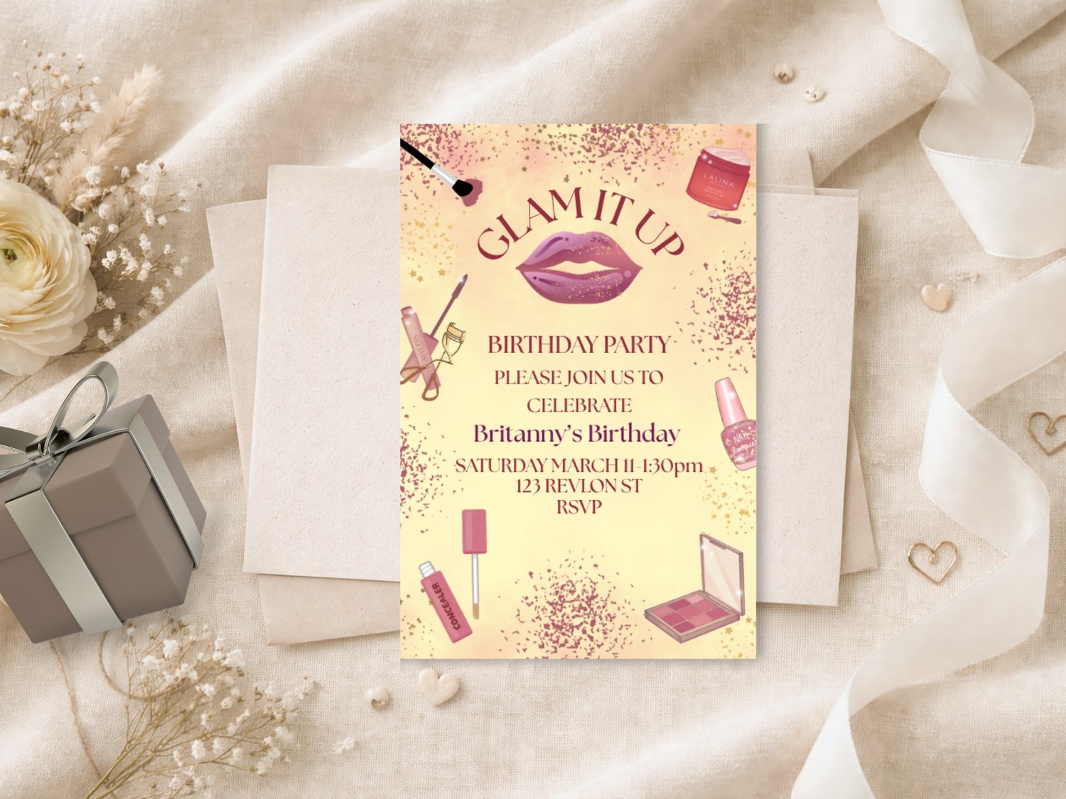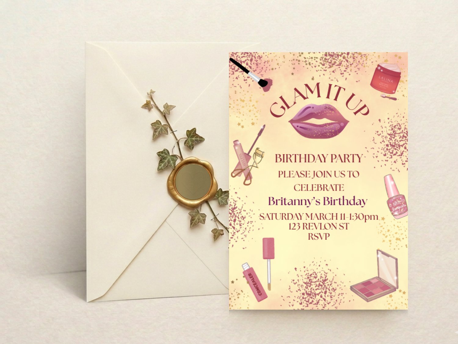 Planning a birthday party for a beauty-loving girl but can’t find an invitation as stylish as she is? This Glam It Up Birthday Invitation is your solution! Featuring a soft sparkle background, bold lips, and makeup-themed accents, this editable 5x7 Canva template makes it easy to create a glamorous, personalized invite that will wow your guests. Customize the details, download instantly, and print or send digitally – no stress, no waiting, no generic cards.