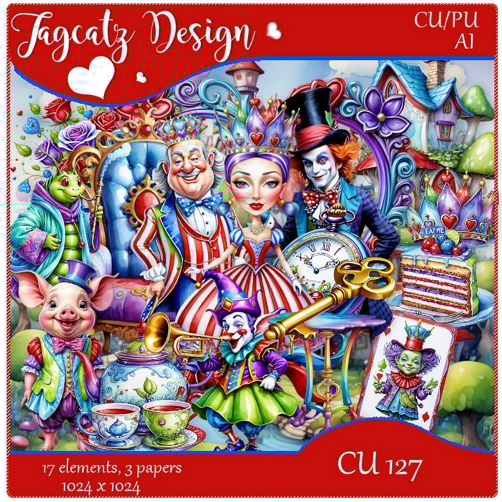 17 elements and 3 papers all with an Alice in Wonderland theme. CU/PU. 1024 x 1024 saved at 300dpi. AI product.