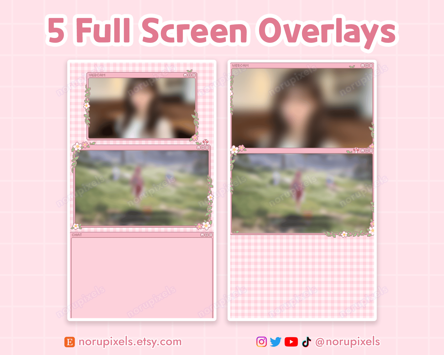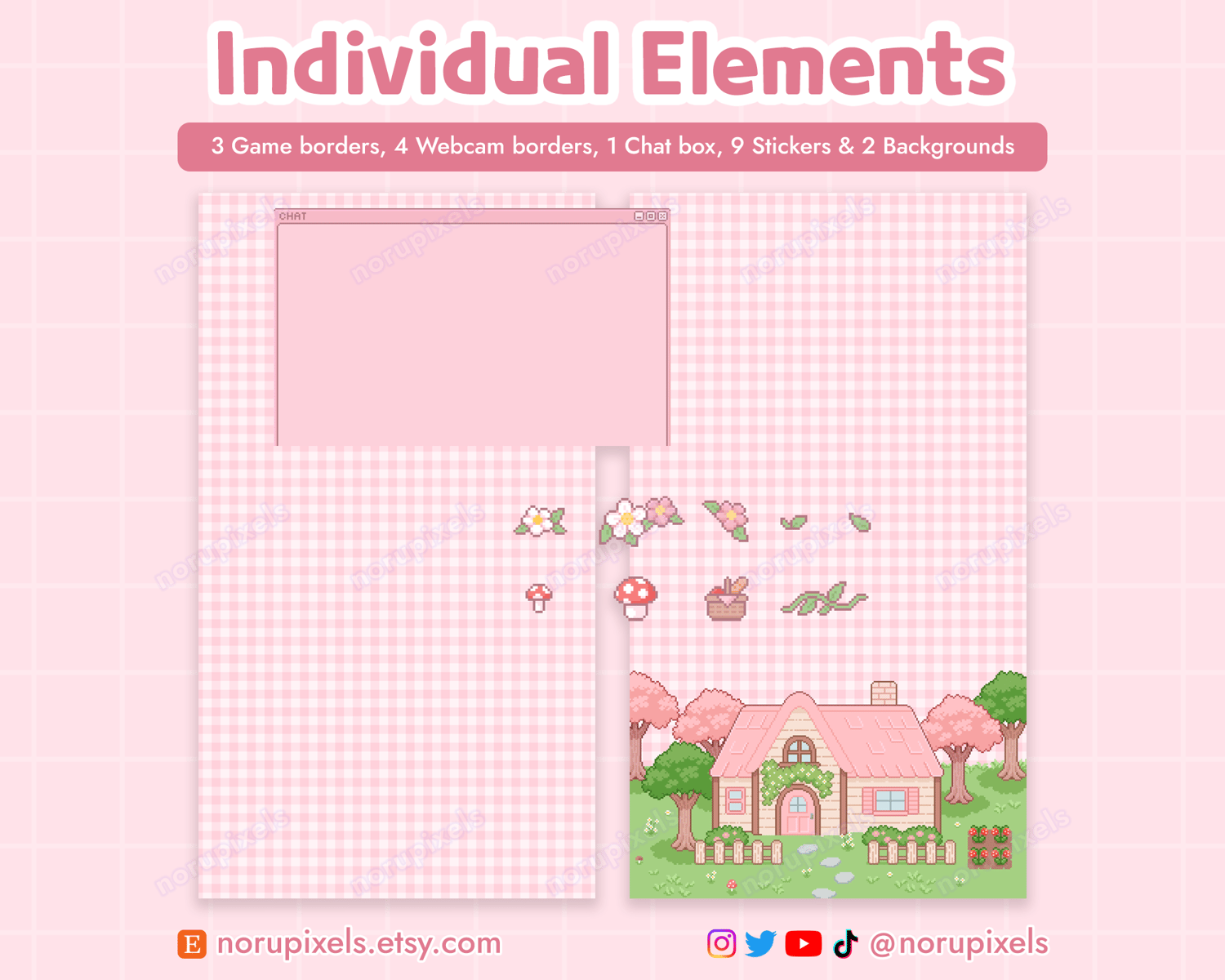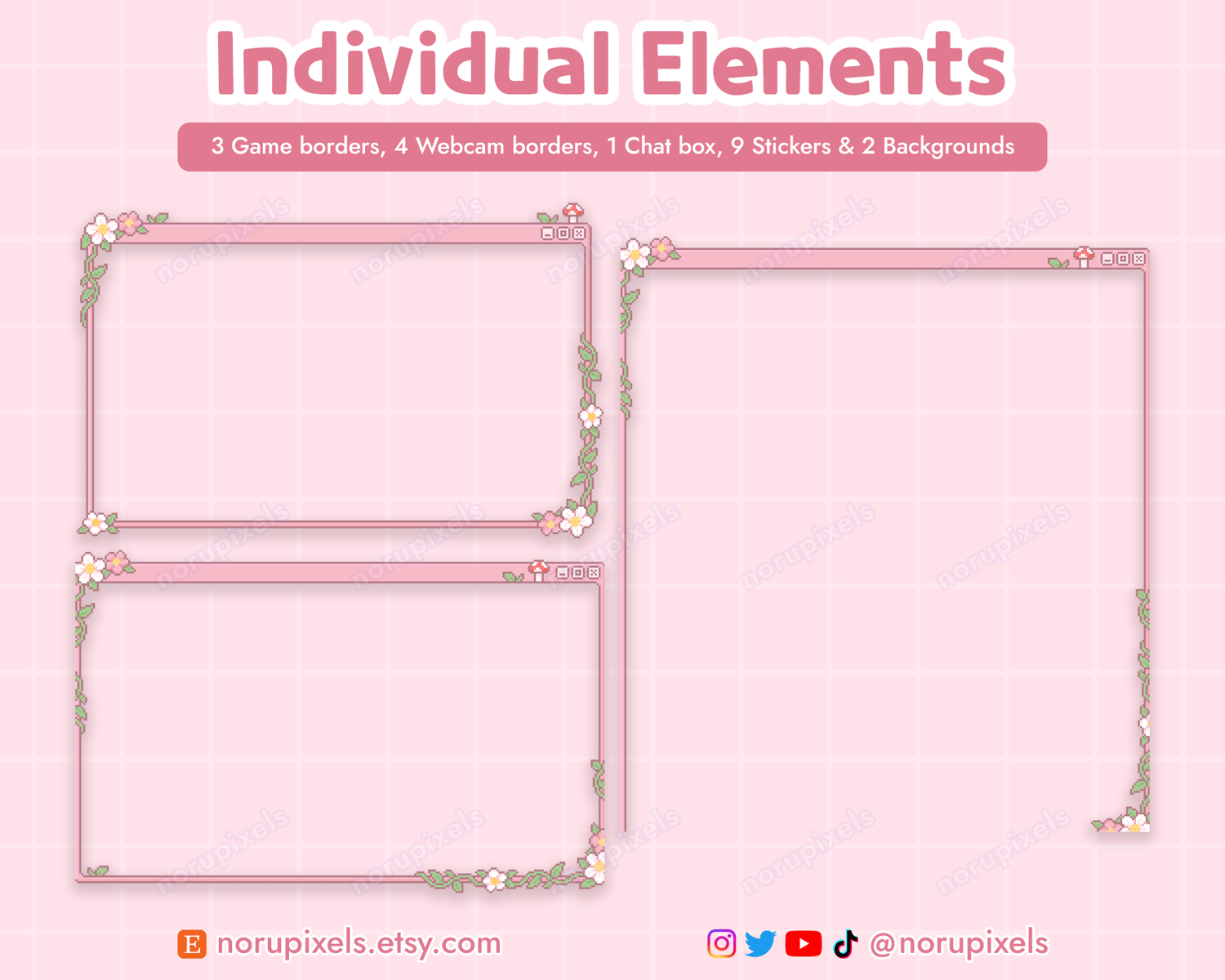 - Individual elements from overlay: 3 game borders, 4 webcam borders, 1 chat box, 9 stickers & 2 backgrounds (.PNG format)