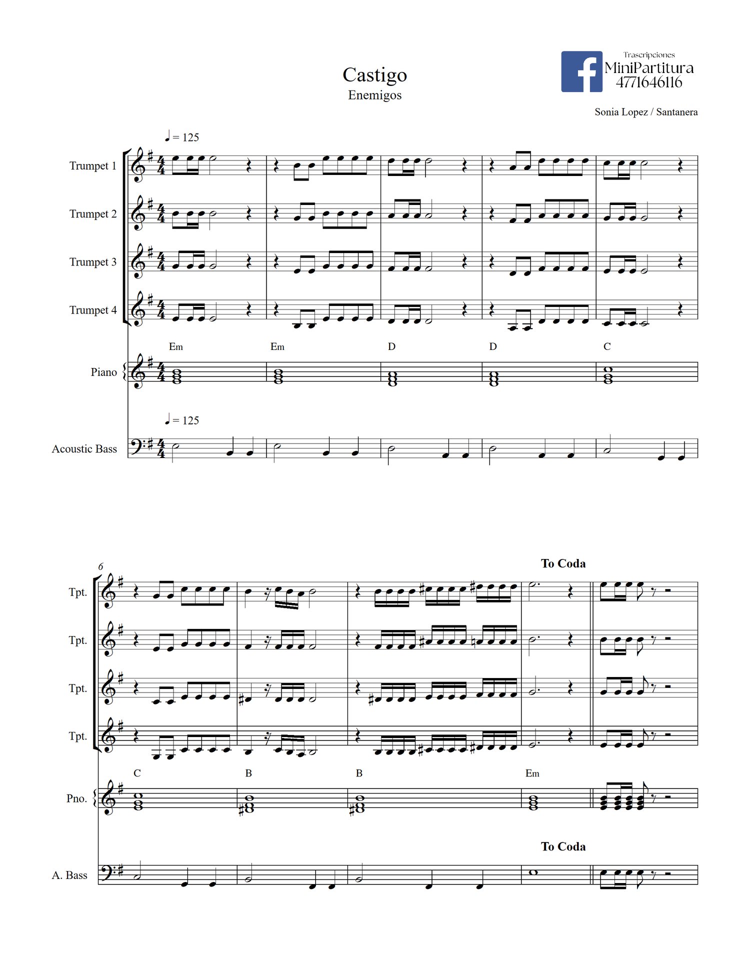 Partitura de la canción (Castigo - Sonia López) Para Trompeta 1,2, 3 y 4, Piano, Bajo (Acústico)