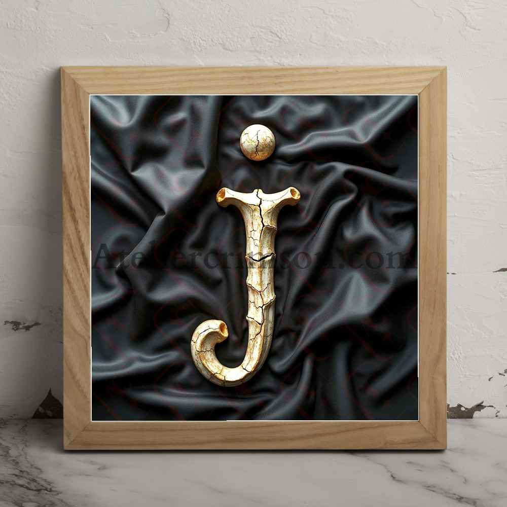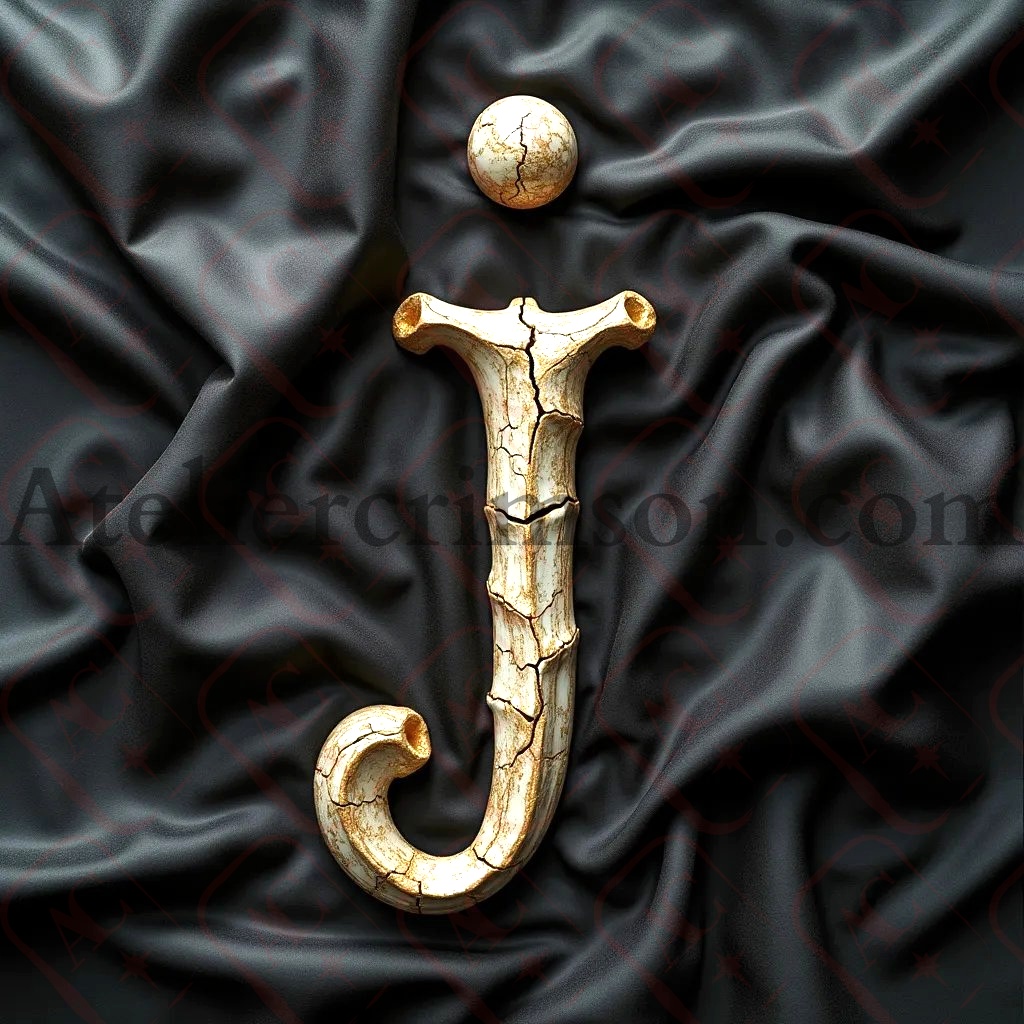 The letter J Bones with gold fissures A hauntingly beautiful character crafted from pristine human femur bones, intricately arranged to form a bold, serif typeface. Delicate golden fissures, reminiscent of kintsugi art, weave through the ivory-white osseous structure, adding an element of elegant repair. The character stands proudly on a luxurious marbled floor, its form casting subtle shadows. Behind it, a textured black linen backdrop provides a striking contrast, emphasizing the letter's ethereal beauty.