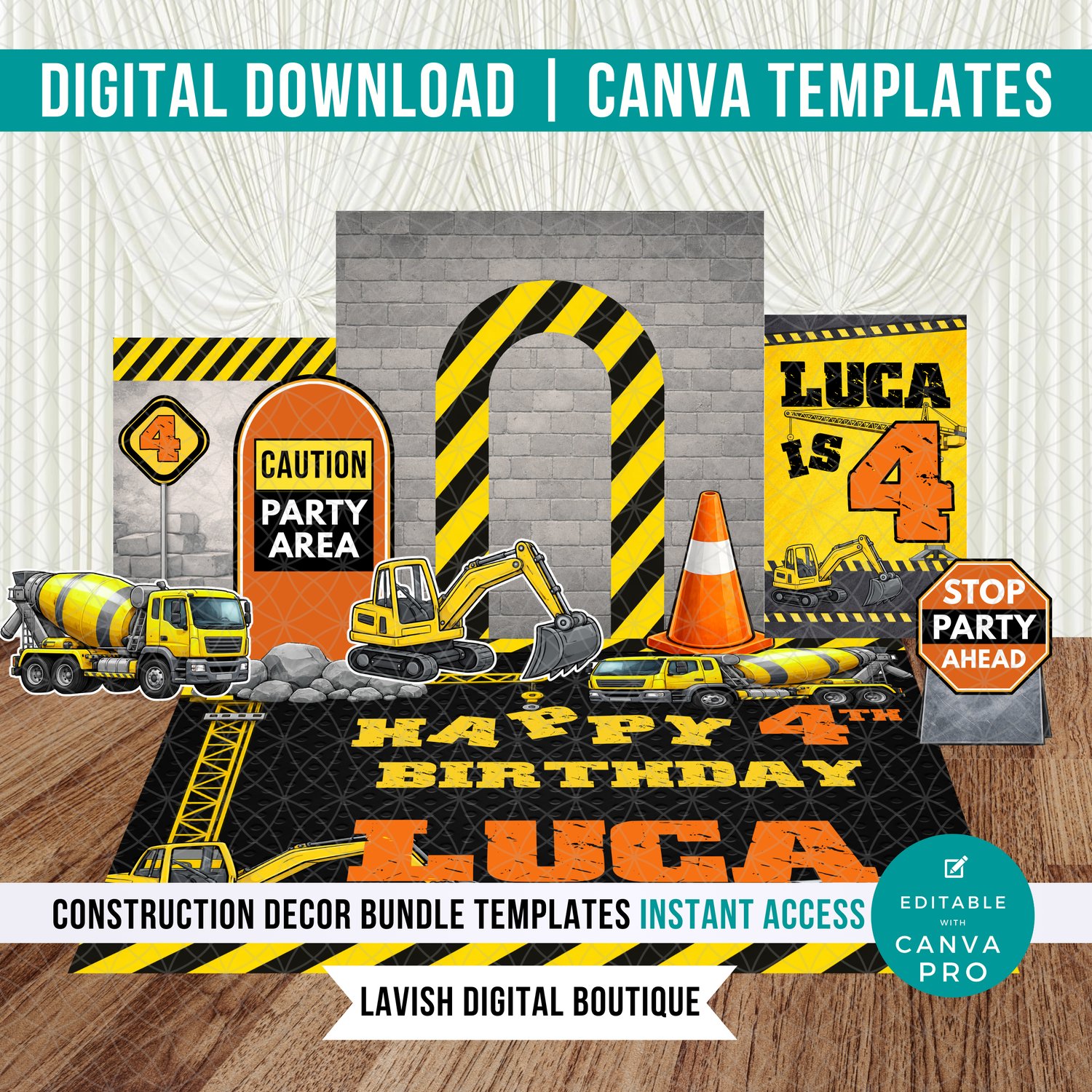 Construction Theme Decor Bundle, Canva Template For Instant Download, Customizable Birthday Party Decor, Editable Arch & Signs