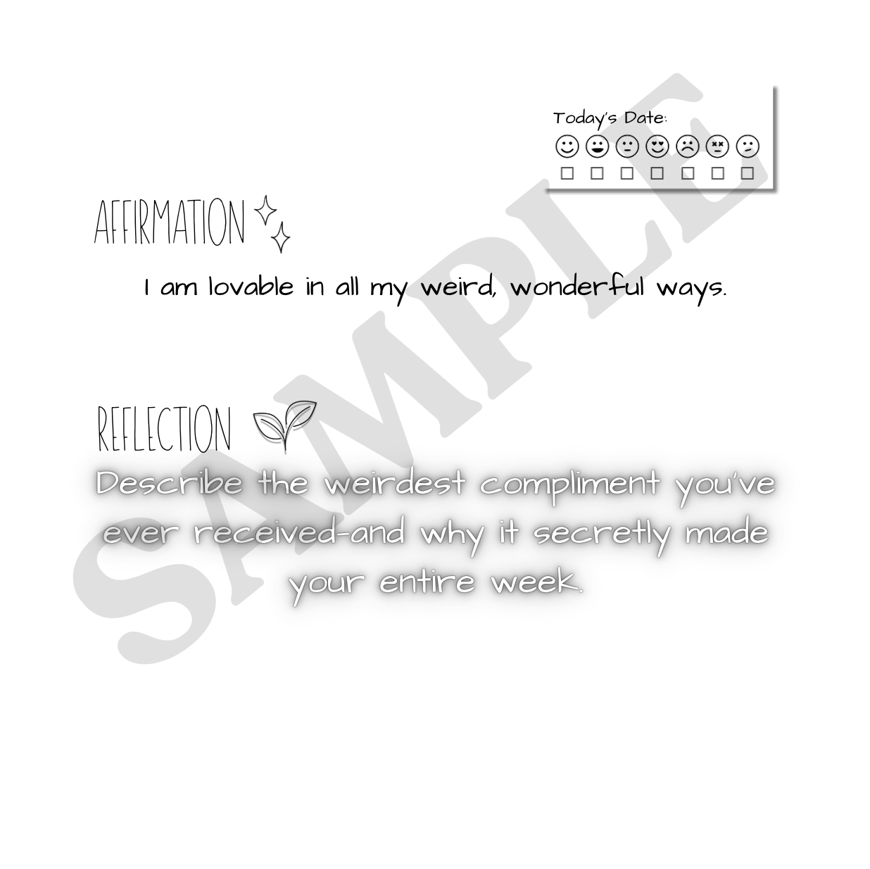 A 60-day guided journal for beautifully quirky souls who are ready to reflect, grow, and embrace the wonderfully weird journey of being human. With 60 unique and playfully worded prompts—each paired with affirmations and two full pages to write—this journal invites you to explore your inner world with humor, honesty, and a whole lot of heart.