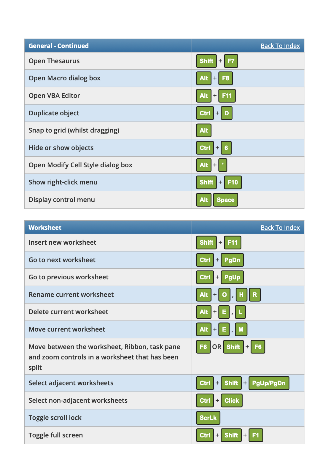 Exceljet Excel Shortcuts Guide – Advanced shortcuts for formulas, data analysis, pivot tables, and more.